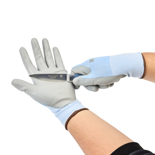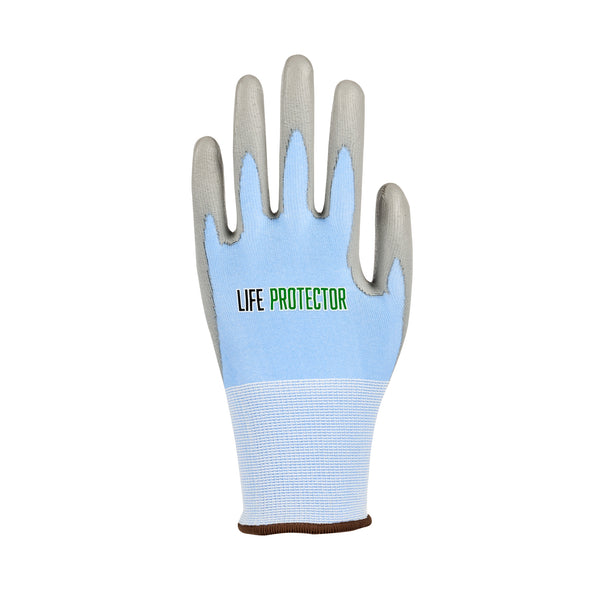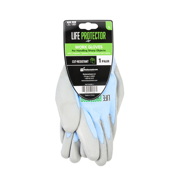 Elevate your workwear standards with our Life Protector Light Blue Diamond Blend Large Work Gloves. These heavy-duty gloves feature a polyurethane coating that shields your hands from chemicals and corrosive substances, ensuring a safer working environment. Perfect for long shifts, these blue gloves come with a breathable foam design that keeps your hands cool and dry throughout the day. With a diamond blend technology, these protective gloves are cut-resistant, making them ideal for handling sharp objects. Designed with an 18-gauge thickness, these hand gloves provide excellent protection against abrasions, making them suitable for tough industrial and construction jobs. These mechanic gloves are hand washable for easy upkeep and maintenance. The sleek light blue finish of these heavy-duty work gloves ensures a neat and professional appearance. Measuring 9.75 inches in length by 4 inches in width, these work gloves are designed to fit comfortably and securely. Each order includes 10 pairs of large work gloves.