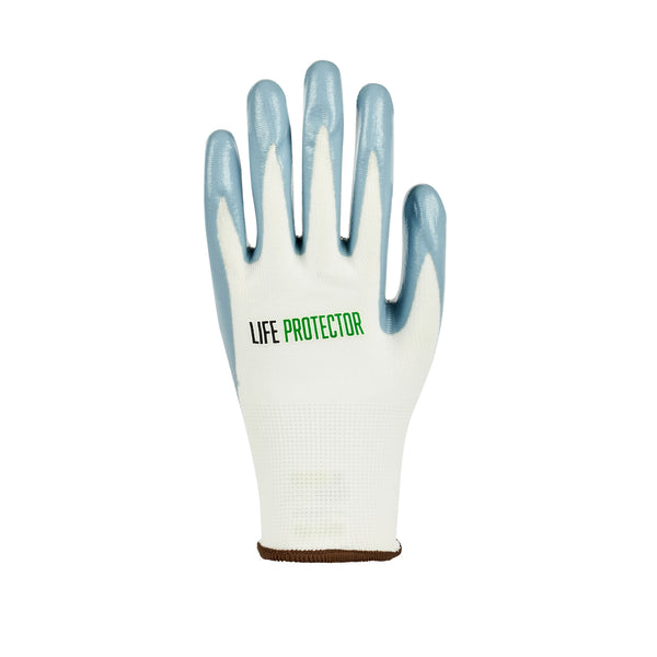 Equip your team with our Life Protector White Nylon Large Work Gloves. These heavy-duty gloves feature a flat nitrile palm coating that is resistant to abrasions and tears for long-lasting use. Designed to ensure you maintain control in various work conditions, these protective gloves provide superior grip on both dry and wet surfaces. The breathable nylon lining of these white work gloves helps keep your hands cool and comfortable during extended wear. With a 13-gauge thickness, these work gloves offer an added layer of protection while working in tough environments. Perfect for handling small parts, these mechanic gloves boast fine grip and dexterity, making them ideal for detailed assembly and repair work. For easy upkeep, these white gloves are hand washable, ensuring they remain in top condition. The crisp white color of these hand protection gloves gives them a neat look. Measuring 9.75 inches in length by 4.25 inches in width, these hand gloves provide a snug fit for optimal functionality. Each order includes 10 pairs of large work gloves.