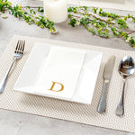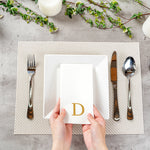 Elevate table settings with absorbent, luxurious disposable napkins. The Luxenap Rectangle Gold Letter D White Paper Linen-Feel Guest Towel / Napkins offer a soft, linen-like feel thanks to their premium airlaid paper construction, enhancing guest comfort during dining. Featuring elegant gold lettering, these personalized napkins add a sophisticated touch, making them ideal for upscale dining settings. With a durable airlaid construction, they withstand heavy dinner service use, ensuring reliability and maintaining their integrity even when wet. The 1/4 fold design of these linen-like napkins saves storage space and reduces clutter, making them a practical choice for busy restaurant environments. Measuring 15.75 inches by 7.87 inches when unfolded, they provide generous coverage for various dining needs. These disposable napkins not only reduce laundering needs but are also biodegradable and recyclable, offering a sustainable solution. Sold in a 50 count box.