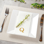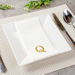 Enhance dining experiences with biodegradable napkins that simplify cleanup. Luxenap Rectangle Gold Letter Q White Paper Linen-Feel Guest Towel / Napkins combine air-laid paper construction with a soft, linen-like feel, ensuring guest comfort and efficient service. The airlaid design enhances absorbency for effective spill control, making these airlaid napkins ideal for any dining setting. The elegant gold letter "Q" design adds a sophisticated touch to table settings, perfect for upscale restaurants or catering services seeking gold design napkins that impress. Measuring 15.75 inches by 7.87 inches, these generously sized, linen-feel napkins offer ample coverage, reducing the need for multiple napkins and contributing to operational efficiency. Made from durable, compostable air-laid paper, they cater to environmentally conscious establishments while maintaining a luxurious feel. Sold in a 50 count box.