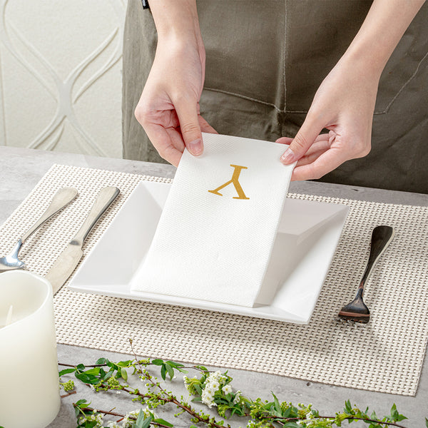 Elevate your dining experience with personalized elegance. Luxenap Rectangle Gold Letter Y White Paper Linen-Feel Guest Towel / Napkin combines luxurious linen-feel air-laid paper construction with a sophisticated gold letter 'Y' design, ensuring exceptional guest comfort and adding a touch of sophistication to your table settings. The air-laid design ensures durability during heavy use, making it an ideal guest towel for upscale events such as weddings and corporate functions. With biodegradable and compostable features, these wedding napkins support eco-friendly operations, aligning with sustainability goals. The generous dimensions of 15.75 inches by 7.87 inches offer ample coverage, while the disposable nature promotes hygiene and simplifies post-event cleanup. Enhance your catering services or formal dining atmosphere with this versatile napkin, perfect for creating a memorable impression. Sold in a 50 count box.