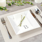Enhance guest dining experiences with elegant disposable options. Luxenap Rectangle Silver Letter B White Paper Linen-Feel Guest Towel / Napkins offer a luxurious linen-feel, air-laid paper that elevates the comfort and sophistication of any table setting while ensuring guests feel pampered. Featuring elegant silver printing, these paper napkins introduce an upscale touch to formal dining events, making them ideal wedding napkins. Their 1/4 fold design simplifies table setting changes for busy service staff, ensuring efficiency during high-demand periods. The absorbent material quickly tackles spills, reducing waste and maintaining a pristine dining environment, which is crucial for maintaining a clean and inviting atmosphere. These linen-feel napkins are perfect for foodservice professionals looking to impress at weddings or upscale events. Measuring 15.75 x 7.87 inches, they offer ample coverage as guest towels or dinner napkins. Sold in a 50 count box.