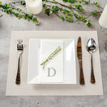 Enhance your dining experience with elegant disposable guest towels. Luxenap Rectangle Silver Letter D White Paper Linen-Feel Guest Towel / Napkin features a luxurious airlaid paper construction that provides a linen-like napkin feel, ensuring a sophisticated touch for fine dining and catering events. The elegant silver letter 'D' print elevates the dining presentation, making it ideal for weddings and upscale gatherings. With a airlaid design, this paper napkin offers exceptional absorbency to tackle spills, maintaining tidiness and guest comfort. Its compact fold saves storage space, perfect for busy kitchens in hotels and restaurants. This disposable guest towel is biodegradable and recyclable, aligning with sustainable practices while eliminating laundering tasks. Measuring 15.75 x 7.87 inches, these absorbent napkins are substantial in size, making them ideal for use as restaurant napkins or luxury paper guest towels. Sold in a 2000 count box.