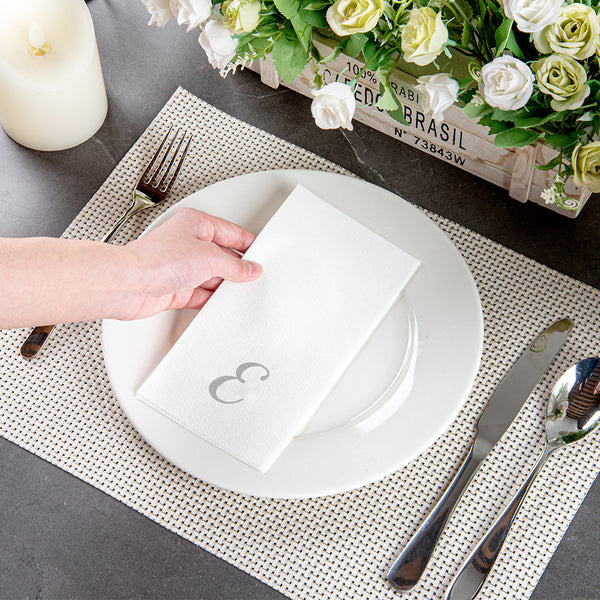 Elevate your dining experience with elegant napkin solutions. Luxenap Rectangle Silver Letter E White Paper Linen-Feel Guest Towel / Napkins provide a luxurious alternative to traditional paper towels, designed to enhance guest experiences with their soft, linen-like texture. Crafted from premium air-laid paper, these disposable napkins boast exceptional absorbency, efficiently tackling spills to maintain a clean dining environment. The sophisticated silver lettering adds a personalized touch, making these luxury disposable napkins ideal for upscale events and fine dining settings. With dimensions of 15.75 inches by 7.87 inches, these napkins offer ample coverage while their paper material ensures they are biodegradable and commercially compostable, supporting eco-conscious initiatives. Impress your guests and maintain an elegant tabletop with these versatile linen-feel napkins. Sold in a 2000 count box.