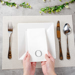 Elevate your dining experience with luxurious linen-feel napkins. Luxenap Rectangle Silver Letter O White Paper Linen-Feel Guest Towel / Napkins, featuring a generous size of 15.75 inches by 7.87 inches, provide a soft, cloth-like texture that enhances guest comfort and sophistication at the table. The elegant design, adorned with a silver letter 'O', adds a personalized and refined touch, ideal for upscale dining and catering events. These disposable guest towels offer the luxury of linen with the practicality of single-use, ensuring hygiene and simplifying cleanup for foodservice professionals. Crafted from air-laid paper, they deliver exceptional absorbency, effectively reducing spills during busy events, making them perfect as luxury paper napkins for fine dining settings. Embrace sustainability with biodegradable material that supports eco-friendly initiatives while maintaining a high standard of elegance. Sold in a 2000 count box.