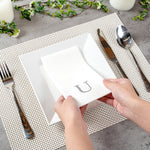 Ensure your dining experience is both elegant and efficient. Luxenap Rectangle Silver Letter U White Paper Linen-Feel Guest Towel / Napkin features a luxurious linen-like texture crafted from air-laid paper, which enhances guest comfort and adds sophistication to upscale dining environments. Its silver letter 'U' design elevates table settings, making it ideal for fine dining and special events. This guest towel napkin offers generous dimensions of 15.75 inches by 7.87 inches, providing ample coverage for a variety of dining occasions. The airlaid texture ensures superior absorbency, effectively tackling spills and maintaining cleanliness. Additionally, its compact folded design saves valuable storage space in busy kitchen areas. Embrace the convenience of a disposable napkin that combines style and practicality, perfect for any refined event. Sold in a 2000 count box.