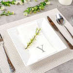 Elevate dining experiences with luxurious linen-feel napkins. The Luxenap Rectangle Silver Letter Y White Paper Linen-Feel Guest Towel / Napkins features premium airlaid paper construction, offering a linen-like feel that enhances the ambiance of upscale restaurants. Their airlaid texture significantly improves absorption, making these disposable guest towels ideal for tackling spills effectively without tearing. Each napkin is adorned with elegant silver lettering in a sophisticated Sans Serif font, adding a personalized touch to any table setting. With their compact fold, these compostable napkins save valuable storage space, allowing busy kitchens to maintain efficiency. Furthermore, their commercially compostable design supports sustainability initiatives, simplifying post-event cleanup in banquet halls and hotels. Measuring 15.75 x 7.87 inches, these rectangle paper napkins are compactly folded to save valuable storage space in busy kitchens. Sold in a 2000 count box.