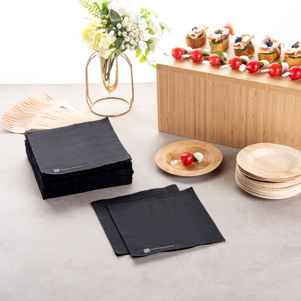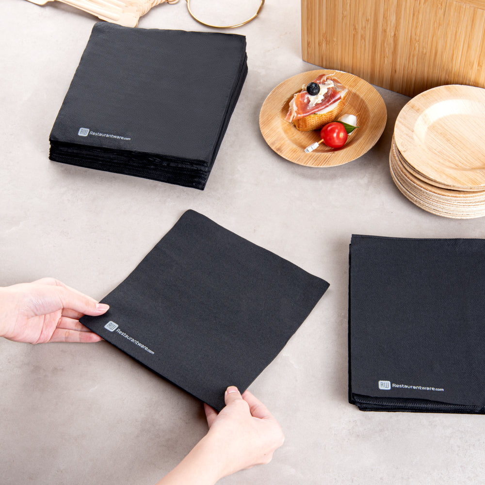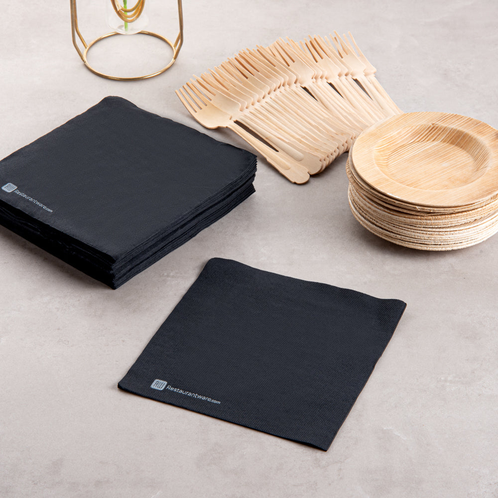 Add a sleek touch of style to your table settings with these Luxenap Micropoint 2-Ply Disposable Napkins. Made from thick 2-ply paper, these black dinner napkins are luxuriously soft and extremely absorbent. Their sturdy construction can be elegantly folded or rolled with silverware to create beautiful event tablescapes, while their conveniently disposable design ensures quick and easy cleanup. Featuring unique micropoint embossed detailing, these napkins add an extra touch of sophistication to any place setting. Use these black paper napkins as restaurant napkins to quickly reset bustling cafes and busy bistros -- or use them as stylish catering napkins to instantly upgrade the look of disposable tableware at catered events. Measuring 7.75 inches in length by 7.5 inches in width when folded, and 15.5 inches in length by 15.25 inches in height when unfolded, these large paper napkins easily cover customers' laps to keep clothing clean and protected. These napkins will arrive pre-folded in a 50 count box.