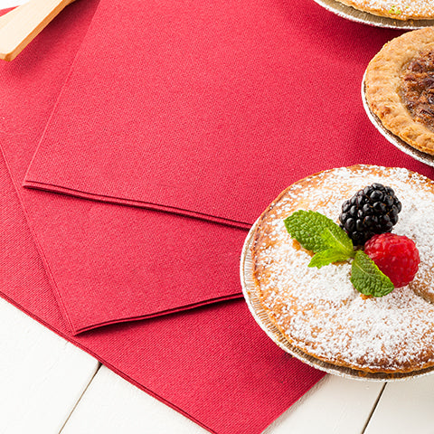 Combining the elegant look and feel of linen napkins with the ultimate convenience of paper napkins, our Luxenap Air Laid Disposable Napkins are ideal for busy restaurants and upscale catering companies. Their unique textile-like surface has the velvety soft touch and natural drape of linen, while their air laid paper construction is impressively strong and absorbent. Designed with a striking bordeaux finish, these brightly colored paper dinner napkins add an eye-catching element to any place setting or tablescape. Use these plush linen-like napkins to quickly reset the tables at a restaurant or cafe, or to instantly enhance the look of disposable tableware at catered events and weddings. Measuring 16 inches by 16 inches when unfolded, these sophisticated red paper napkins easily cover guests' laps to keep their clothing pristine and protected. Each of these linen-like paper dinner napkins will arrive conveniently pre-folded in a ready-to-use 8-inch by 8-inch square. Sold in a 600 count box. Note: A small Restaurantware logo is printed on each napkin.