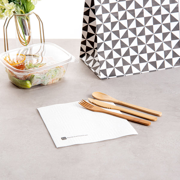 - Pre-folded napkins wrap around cutlery to easily reset tables