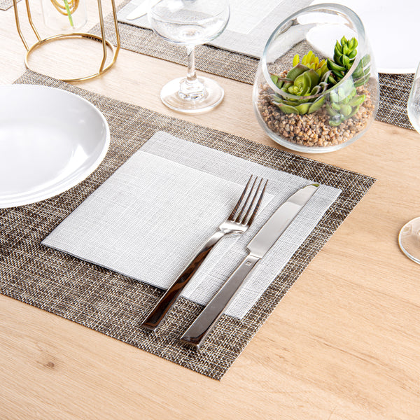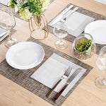 Our Luxenap Air Laid Disposable Napkins merge the sumptuously soft touch of linen with the ultimate convenience of disposable paper napkins. Constructed from premium air laid paper, these linen-like napkins are exquisitely soft and extremely absorbent. Their textile-like surface has the velvety feel and natural drape of linen napkins, while their contemporary gray-threaded print adds a sophisticated touch to place settings and tablescapes. Use these high-quality paper napkins to quickly reset tables at a trendy wine bar or bustling bistro, or use them to effortlessly enhance the look of disposable tableware at catered events and corporate functions. Measuring 16 inches by 16 inches when unfolded, these linen-like paper dinner napkins comfortably cover guests' laps to keep clothing pristine and protected. For your convenience, these paper napkins will arrive pre-folded in ready-to-use 8-inch by 8-inch squares. Sold in a 25 count box.