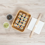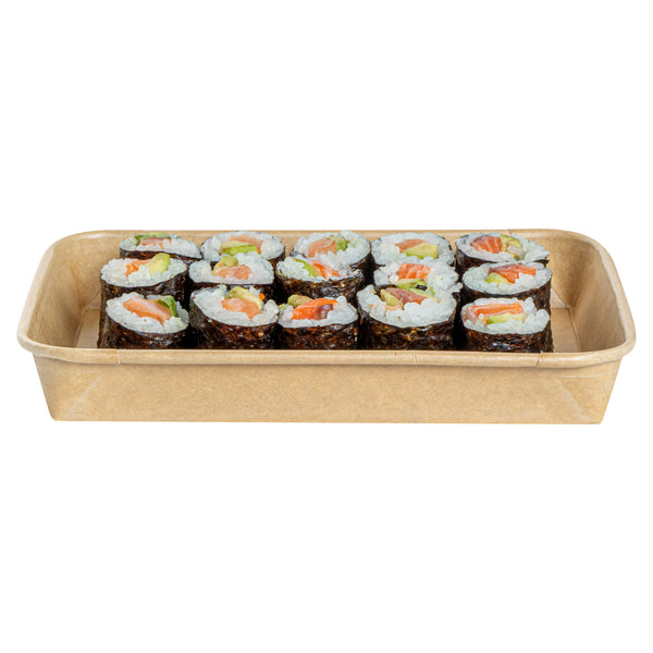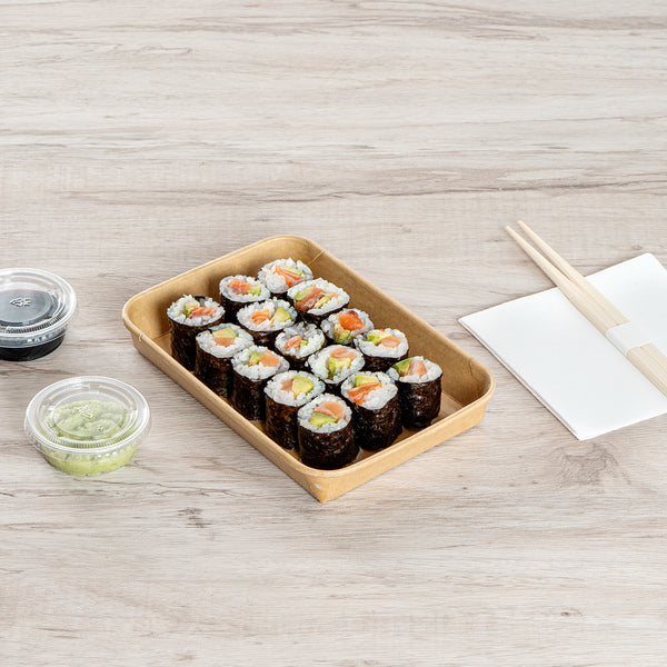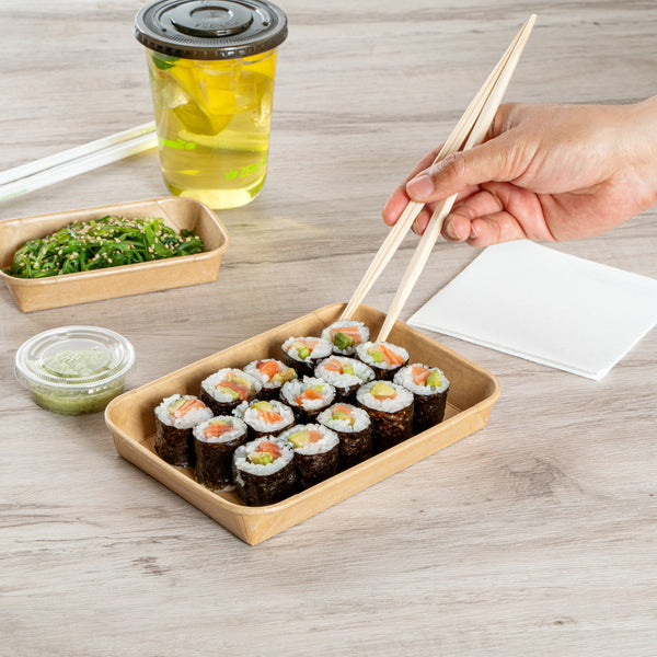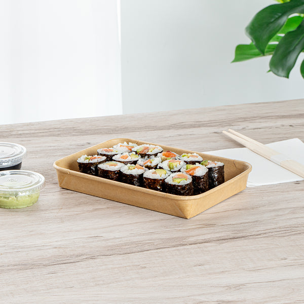 Enhance your food presentation and delivery with our Matsuri Vision 11-ounce Rectangle Kraft Paper Sushi Containers. These sushi boxes feature a greaseproof PE coating that prevents sauces and oil from leaking through, ensuring a mess-free dining experience. For ultimate portability, pair these to go containers with their coordinating clear plastic lids (SKU: RWA1448C) and form a tight seal to keep your food intact in transit. These take out boxes are freezer-safe and ideal for refrigerating your leftovers for later use. Created from premium paper, these takeaway boxes are durable and suitable for serving various cold food items. The sturdy base of these paper to go containers ensures reliable support, making them ideal for securely holding and transporting your food items. Designed for convenience, these carry out containers are disposable and can be discarded after use for an easy cleanup. These paper take out boxes are recyclable and offer an ecologically-conscious alternative to traditional plastic containers. The rustic kraft look of these disposable food containers adds a natural, charming appeal, perfect for enhancing the presentation of your meals. Measuring 7.25 inches in length by 5 inches in width by 1 inch in height, these rectangle take out boxes have a capacity of 11 ounces. Sold in a 100 count box. Lids are available and sold separately.