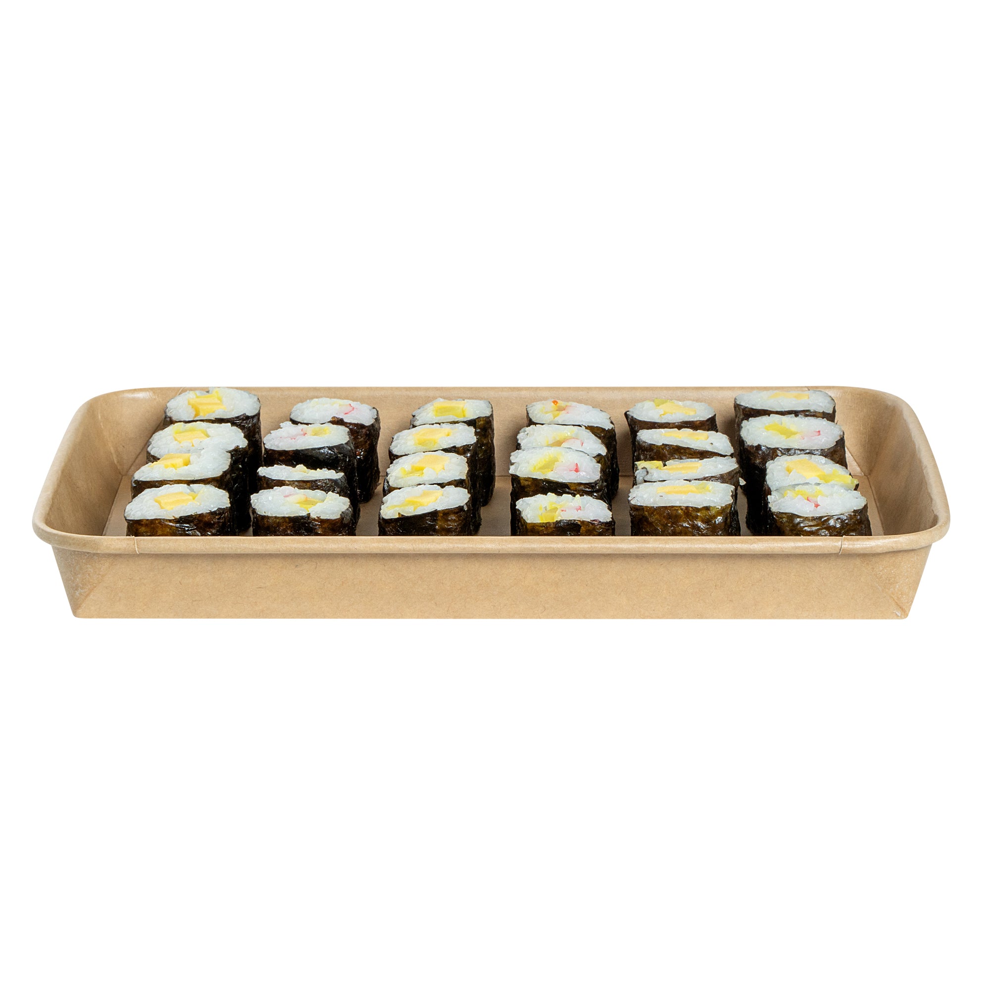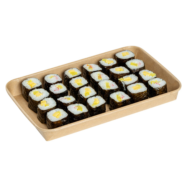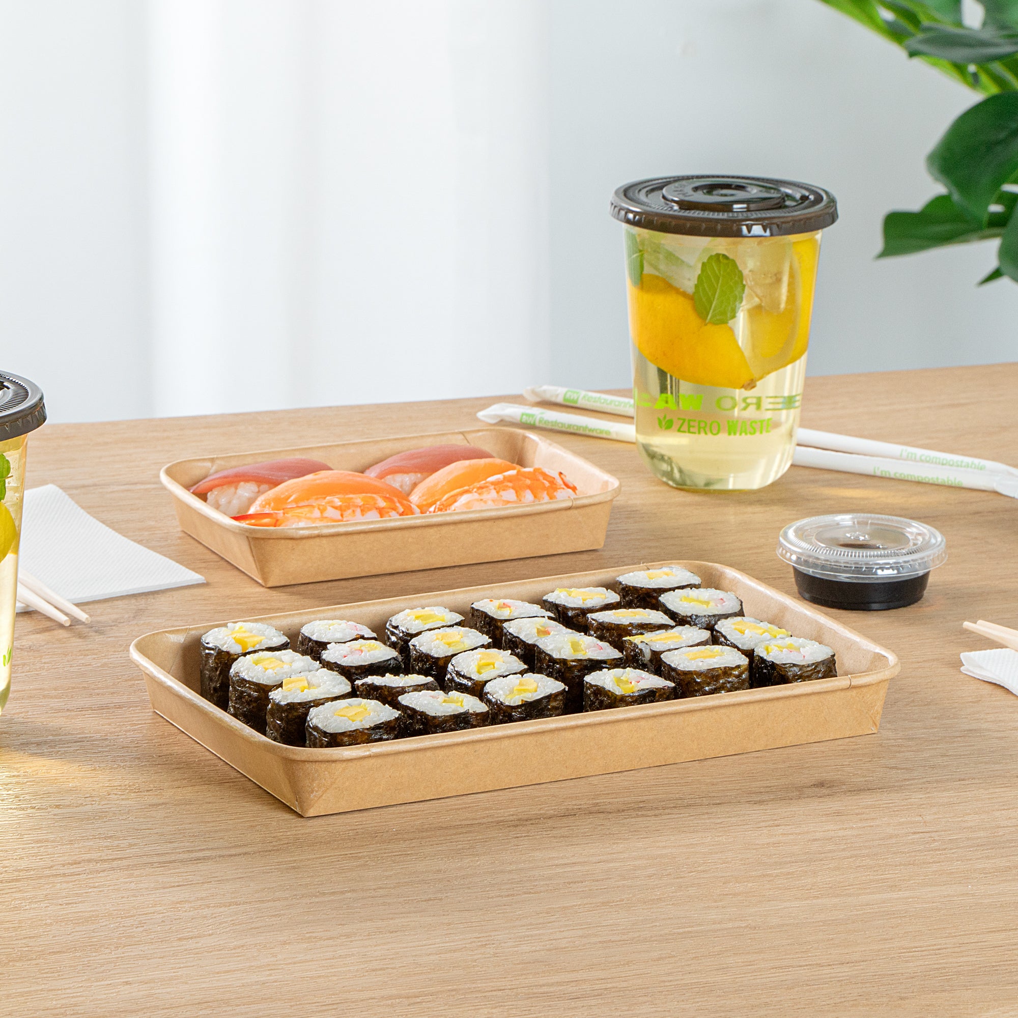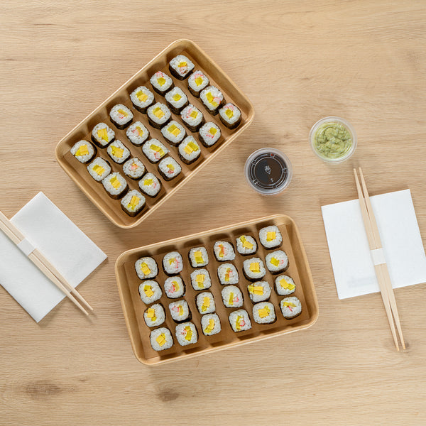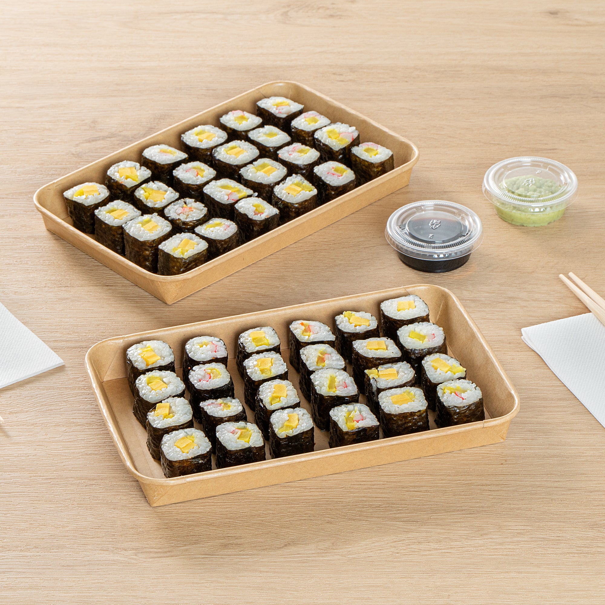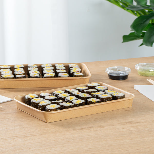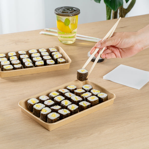 Effortlessly serve your delicious sushi creations with our Matsuri Vision 20-ounce Rectangle Kraft Paper Sushi Containers. These sushi boxes have a greaseproof PE coating that prevents sauces and oil from leaking, ensuring a mess-free dining experience. For an ideal take out solution, these to go containers can be paired with their coordinating clear plastic lids (SKU: RWA1452C) to form a secure seal and ensure your meals stay intact in transit. These take out boxes are freezer-safe and allow you to store leftovers in the refrigerator. Crafted from premium paper, these takeaway boxes are durable and suitable for serving a wide variety of cold food items. These carry out containers are equipped with a sturdy base for reliable support and securely hold your exquisite sushi roll. For a straightforward cleaning experience, these disposable food containers can be discarded after use. These paper take out boxes are recyclable and offer an eco-friendly alternative to traditional plastic containers. The rustic kraft look of these to go boxes creates a natural presentation, perfect for showcasing your culinary creations. These takeaway containers measure 9.5 inches in length by 6 inches in width by 1 inch in height and have a capacity of 20 ounces, making them perfect for substantial portions. Sold in a 100 count box. Lids are available and sold separately.