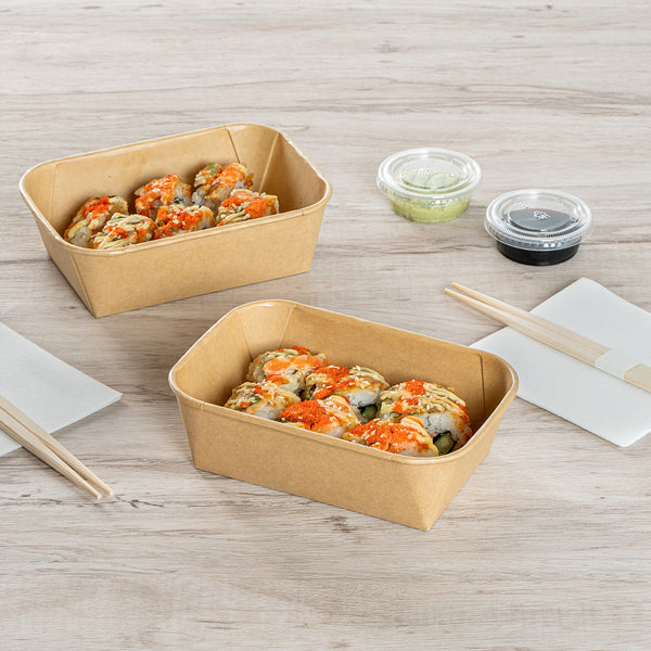Enhance your food presentation with our Matsuri Vision 22-ounce Rectangle Kraft Paper Sushi Containers. These sushi boxes are designed with a greaseproof PE coating that effectively prevents sauces and oils from leaking through, preserving the cleanliness of your food presentation. Ideal for on-the-go meals, these takeaway boxes can be paired with coordinating clear plastic lids (SKU: RWA1459C-50) to keep your meals intact in transit. Perfect for storing leftovers, these to go containers are freezer-safe and keep your food fresh for later use. Crafted from premium paper, these carry out containers are durable and suitable for serving cold food items. These take out boxes boast a sturdy base that provides reliable support and stability for secure food storage and transportation. For a simplified cleaning experience, these disposable food containers can be discarded after use. These to go boxes are recyclable and provide a better alternative to traditional plastic containers. Boasting a rustic kraft style, these paper take out boxes complement the colors and textures of your delicious sushi. These takeaway containers measure 6.5 inches in length by 4.75 inches in width by 2 inches in height and have a capacity of 22 ounces. Sold in a 50 count box. Lids are available and sold separately.