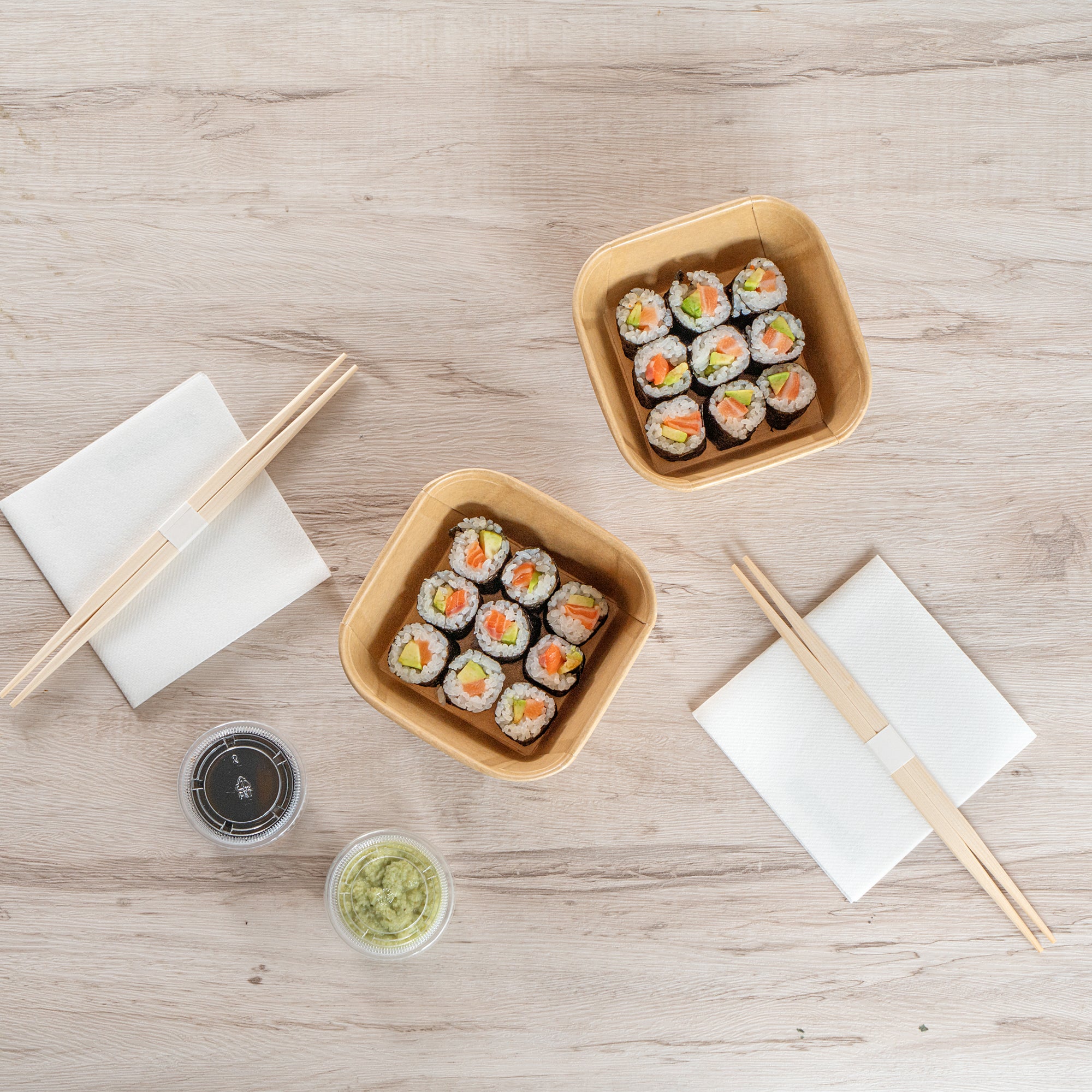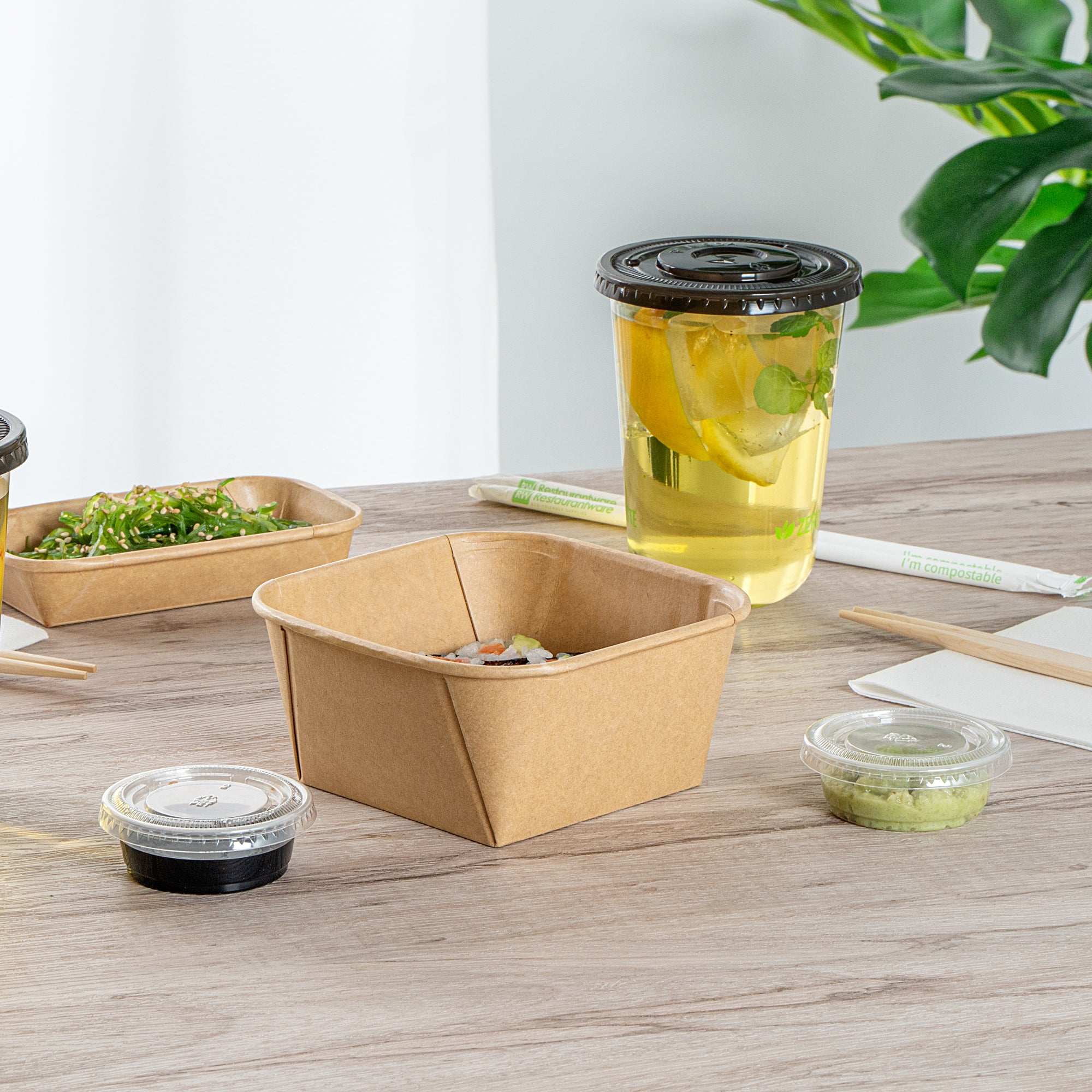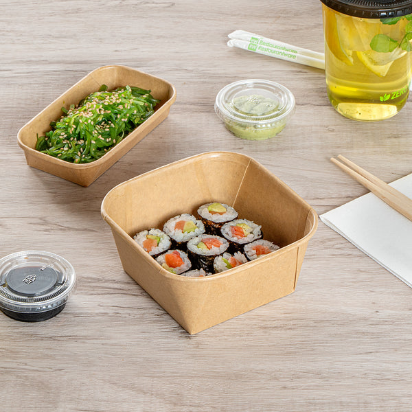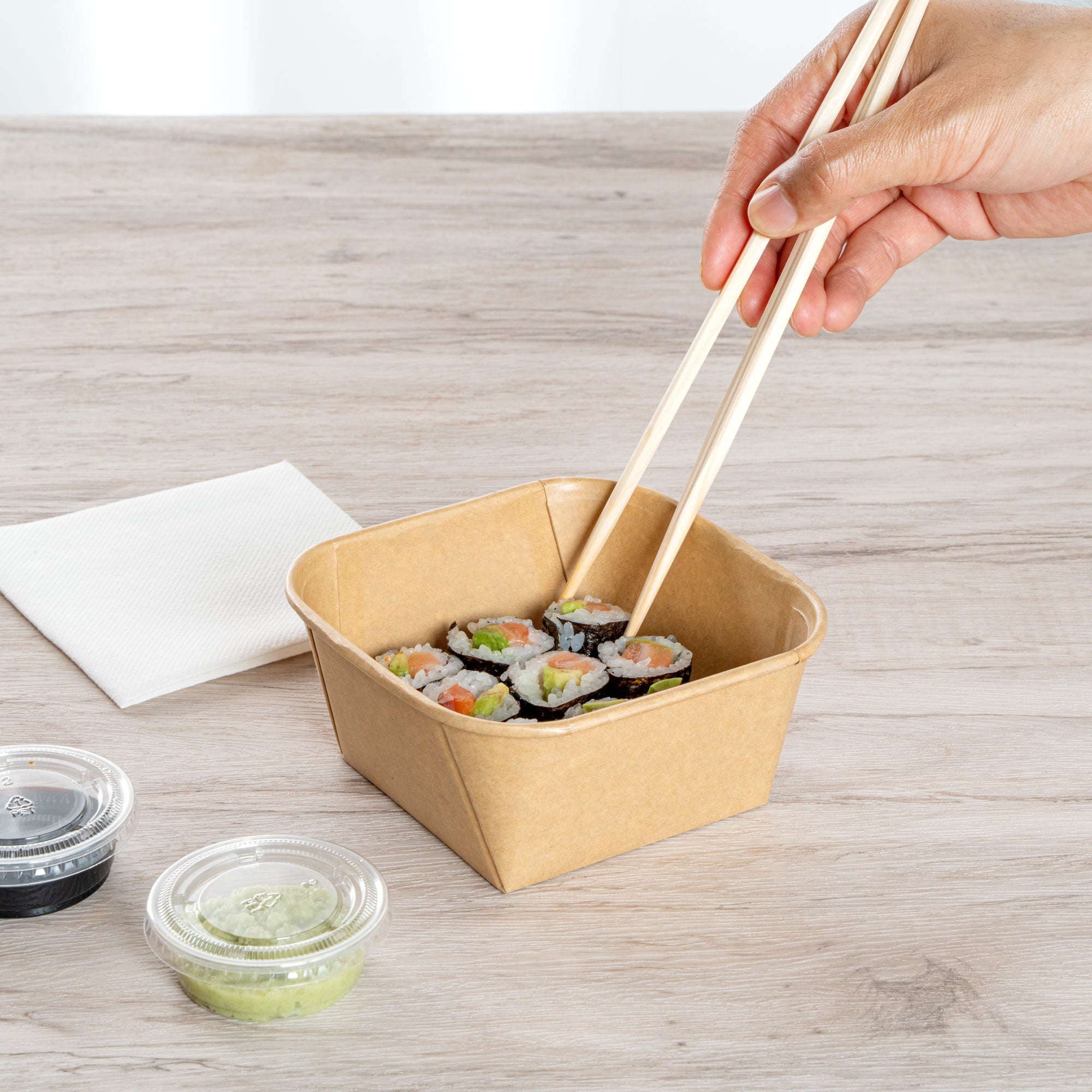 Upgrade your sushi presentation with our Matsuri Vision 22-ounce Square Kraft Paper Sushi Containers. These sushi boxes feature a PE coating that prevents sauces and oil from leaking through, ensuring a clean and delicious appearance. Pair these takeaway boxes with their coordinating clear plastic lids (SKU: RWA1463C-50) for a secure fit and keep your meals intact during transportation. These take out boxes are freezer-safe and ideal for storing leftovers in the refrigerator. Crafted from premium paper, these to go containers are durable and suitable for serving various cold food items. These carry out containers feature a sturdy base, ensuring reliability and stability for securely transporting and storing food items. For a straightforward cleaning experience, these disposable take out boxes can be discarded easily, saving time and effort. These takeaway containers are recyclable and provide an eco-friendly alternative to traditional plastic containers, helping to minimize your carbon footprint. With a kraft finish, these paper take out boxes boast a rustic and visually appealing design, enhancing the presentation of your food. These sushi containers measure 5 inches in length by 5 inches in width by 2.25 inches in height and have a capacity of 22 ounces, making them perfect for ample servings. Sold in a 50 count box. Lids are available and sold separately.