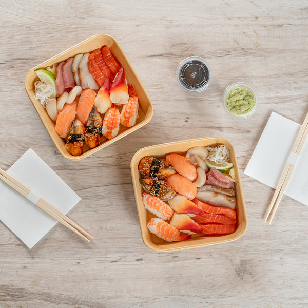 Pack your sushi orders with our Matsuri Vision 34-ounce Square Kraft Paper Sushi Containers. These sushi boxes feature a PE coating that prevents sauces and oil from leaking through, ensuring a mess-free dining experience. Pair these takeaway boxes with their coordinating clear plastic lids (SKU: RWA1467C-50) to make them portable and convenient for customers on the go. These take out boxes are freezer-safe and are perfect for storing leftovers in the refrigerator for later use. Created from premium paper, these to go containers are durable and suitable for serving a wide variety of cold food items. These carry out containers are disposable and can be discarded after use, providing a straightforward cleaning experience. Suitable for eco-conscious foodservice establishments, these disposable food containers are recyclable and offer a sustainable alternative to traditional plastic containers. Boasting a kraft finish, these paper take out boxes create a rustic and natural look for your food presentation. These to go boxes measure 7 inches in length by 7 inches in width by 2 inches in height and have a capacity of 34 ounces, offering ample space for your culinary creations. Sold in a 50 count box. Lids are available and sold separately.