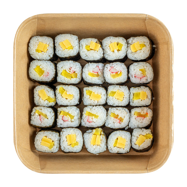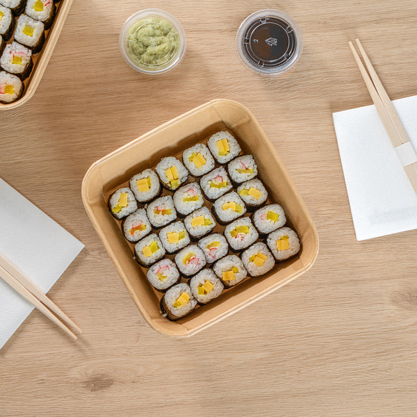 Serve exquisite sushi with our Matsuri Vision 45-ounce Square Kraft Paper Sushi Containers. Equipped with a greaseproof PE coating, these sushi boxes prevent sauces and oil from leaking, ensuring a tidy dining experience. These to go containers can be paired with their matching clear plastic lids (SKU: RWA1467C-50) to form a tight seal and keep your food intact during transportation. Designed to be freezer-safe, these take out boxes are perfect for storing leftovers in the refrigerator for later use. Crafted from premium PET paper, these takeaway boxes are durable and ideal for serving a wide variety of cold food items. These carry out containers are disposable and can be discarded after use, providing an easy cleaning experience. Suitable for eco-conscious foodservice establishments, these disposable food containers are recyclable and offer a sustainable alternative to traditional plastic containers. With a charming kraft finish, these paper take out boxes create a rustic look for your food presentation. These food containers measure 7 inches in length by 7 inches in width by 2.25 inches in height and have a capacity of 45 ounces. Sold in a 50 count box. Lids are available and sold separately.