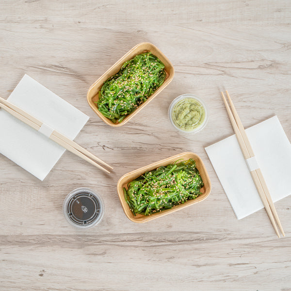 Elevate your food presentation with our Matsuri Vision 5-ounce Rectangle Kraft Paper Sushi Containers. These sushi boxes feature a greaseproof PE coating that prevents sauces and oils from leaking through, ensuring a mess-free dining experience. Pair these to go containers with their coordinating clear plastic lids (SKU: RWA1440C) to create a snug seal, keeping your food intact in transit. These carry out containers are freezer-safe, allowing you to store leftovers in the refrigerator for later use without compromising freshness. Made from durable paper, these take out boxes are ideal for packing a wide variety of cold food items, including sandwiches or salads. Designed with a sturdy base, these paper take out boxes hold your handcrafted sushi, ensuring safe and convenient transport. These takeaway boxes are disposable and can be discarded after use, ensuring post-meal cleanup is a breeze. The kraft finish of these rectangle take out containers adds a natural and rustic charm, perfect for showcasing your delicious food offerings. To help minimize your carbon footprint, these sushi containers are recyclable and offer a better alternative to traditional plastic containers. Measuring 5.5 inches in length by 3.25 inches in width by 1 inch in height these take out containers have a capacity of 5 ounces and offer ample space for sushi rolls. Sold in a 100 count box. Lids are available and sold separately.