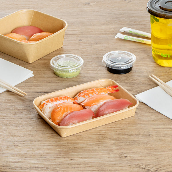 Elevate your food presentation and delivery with our Matsuri Vision 8-ounce Rectangle Kraft Paper Sushi Containers. With a greaseproof PE coating, these sushi boxes prevent sauces and oil from leaking through, ensuring a mess-free eating experience. These to go containers can be paired with their matching clear plastic lids (SKU: RWA1446C) and form a tight seal, keeping your food intact during transit. Ideal for storing food, these take out boxes are freezer-safe and let you refrigerate your leftovers. Crafted from durable paper, these takeaway boxes are perfect for serving various cold or chilled food items. These carry out containers are designed with a sturdy base and securely hold your food items in transportation. For a straightforward cleaning experience, these disposable food containers allow you to discard them after use. These paper takeaway containers are recyclable and offer an environmentally-friendly alternative to traditional plastic containers. The rustic kraft look of these to go boxes adds a charming and natural appeal, perfect for enhancing the presentation of your meals. These sushi containers measure 6.5 inches in length by 4.5 inches in width by 1 inch in height and can hold up to 8 ounces, making them ideal for single-serve portions. Sold in a 100 count box. Lids are available and sold separately.