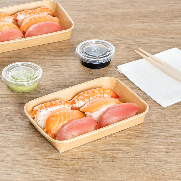 Elevate your food presentation and delivery with our Matsuri Vision 8-ounce Rectangle Kraft Paper Sushi Containers. With a greaseproof PE coating, these sushi boxes prevent sauces and oil from leaking through, ensuring a mess-free eating experience. These to go containers can be paired with their matching clear plastic lids (SKU: RWA1446C-50) and form a tight seal, keeping your food intact during transit. Ideal for storing food, these take out boxes are freezer-safe and let you refrigerate your leftovers. Crafted from durable paper, these takeaway boxes are perfect for serving various cold or chilled food items. These carry out containers are designed with a sturdy base and securely hold your food items in transportation. For a straightforward cleaning experience, these disposable food containers allow you to discard them after use. These paper takeaway containers are recyclable and offer an environmentally-friendly alternative to traditional plastic containers. The rustic kraft look of these to go boxes adds a charming and natural appeal, perfect for enhancing the presentation of your meals. These sushi containers measure 6.5 inches in length by 4.5 inches in width by 1 inch in height and can hold up to 8 ounces, making them ideal for single-serve portions. Sold in a 50 count box. Lids are available and sold separately.
