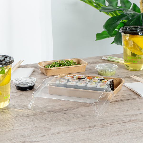 Enhance your sushi presentation with our Matsuri Vision Clear PET Plastic Lids. Pair these plastic lids with matching containers (SKU: RWA1447K-50) to form a tight-fitting seal and prevent accidental openings or spills while on the go. The anti-fog design of these lids for food containers prevents condensation buildup, ensuring customers can easily see the contents inside. With a dome-inspired shape, these clear plastic lids create ample space to accommodate tall sushi rolls or decorative garnishes, maintaining their visual appeal and freshness. The crystal-clear finish of these dome lids highlights the intricate details and vibrant colors of sushi, elevating its presentation and enticing diners visually. These container lids are crafted from PET plastic for premium durability and sturdiness for optimal performance. To minimize your post-meal cleaning experience, these disposable lids can be discarded after use. These clear lids are recyclable and offer an eco-friendly alternative to traditional plastic lids. Measuring 7.5 inches in length by 5.25 inches in width by 1.25 inches in height, these to go sushi container lids snugly seal your take out containers. Sold in a 50 count box. Containers are available and sold separately.
