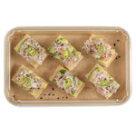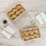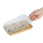 Enhance your food presentation with our Matsuri Vision Clear PET Plastic Lids. Pair these plastic lids with compatible containers (SKU: RWA1449K-50) to form a tight seal and prevent accidental openings or spills while on the go. With an innovative anti-fog design, these lids for food containers avoid build up condensation, ensuring customers can easily see the contents inside without obstruction. The dome-inspired shape of these clear plastic lids provides generous room and protects your sushi arrangements without squishing them. These dome lids have a transparent finish and showcase your food's vibrant colors and textures. Crafted from PET plastic, these container lids are durable and sturdy for optimal performance. These to go container lids are disposable and can be discarded after use for an easy cleanup. Ideal for eco-conscious foodservice establishments, these disposable lids are recyclable to reduce your carbon footprint. Each clear lid measures 8.75 inches in length by 5.5 inches in width by 1.25 inches in height. Sold in a 50 count box. Containers are available and sold separately.