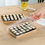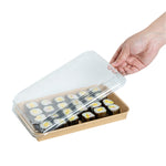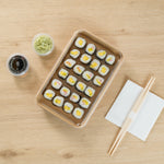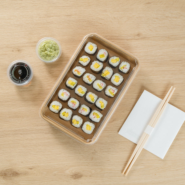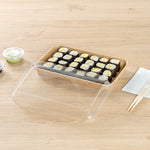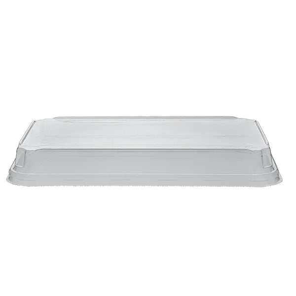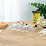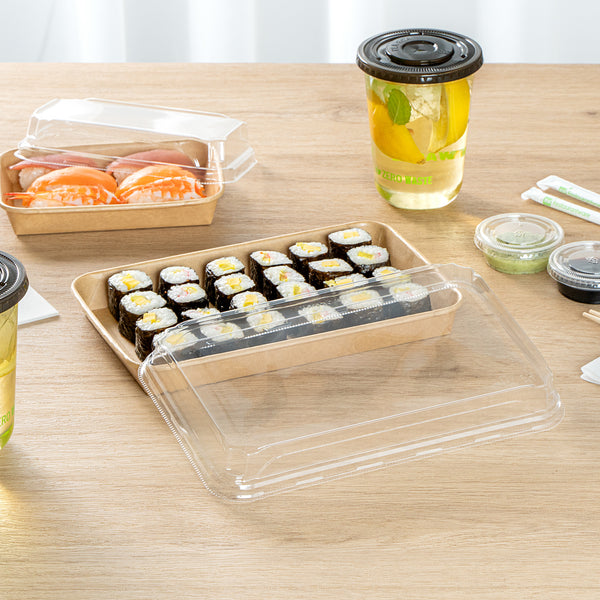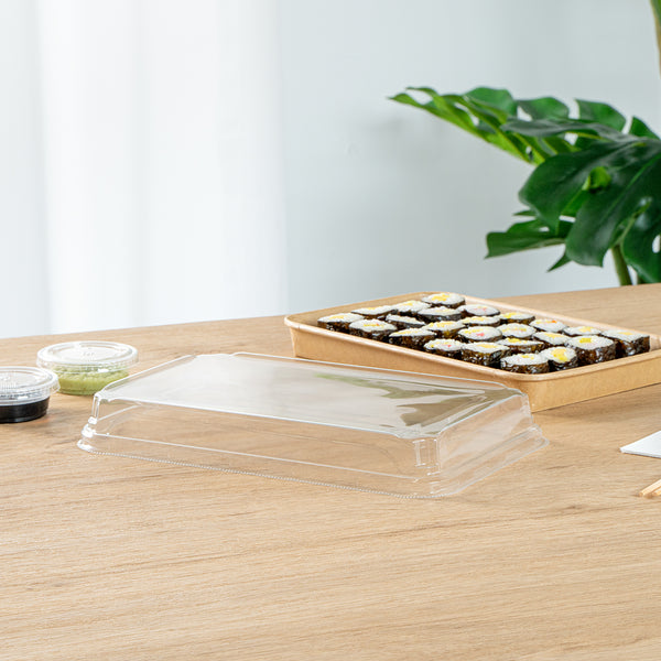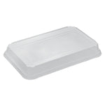 Enhance your food presentation with our Matsuri Vision Clear PET Plastic Lids. These plastic lids can be paired with matching containers (SKU: RWA1451K-50) and form a tight-fitting seal to prevent accidental openings or spills while on the go. Featuring an anti-fog design, these lids for food containers avoid build up condensation, ensuring customers can easily see the contents inside without obstruction. These dome lids provide spacious accommodation for sushi arrangements, avoiding any flattening or squishing of delicate components. With a sleek transparent finish, these container lids beautifully display the colors and textures of sushi, elevating its aesthetic appeal. Created from PET plastic, these clear lids are durable and sturdy to protect your packed sushi. These clear plastic lids are disposable and can be discarded after use for a straightforward cleaning experience. Ideal for eco-conscious foodservice establishments, these disposable lids are recyclable and help minimize your carbon footprint. Measuring 9.5 inches in length by 6 inches in width by 1.25 inches in height, these to go container lids are perfect for securely packaging sushi and sashimi. Sold in a 50 count box. Containers are available and sold separately.