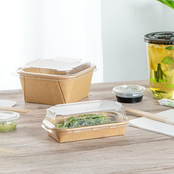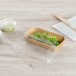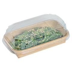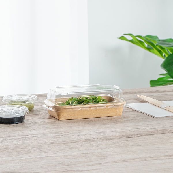 Protect your food toppings with our Matsuri Vision Clear PET Plastic Lids. These plastic lids form a tight-fitting seal with their coordinating sushi containers (SKU: RWA1439K) and keep your food intact during transit. Featuring an anti-fog design, these clear lids prevent condensation buildup, allowing customers to easily see the mouthwatering contents inside. These dome lids provide ample room and ensure the delicate arrangements of sushi rolls, nigiri, or sashimi are protected without being squashed or smudged. With a crystal clear finish, these container lids showcase the vibrant colors and appetizing presentation of the sushi inside. These lids for food containers are made from premium PET plastic for robust durability and sturdiness. Ideal for eco-conscious foodservice establishments, these disposable lids are recyclable to minimize your carbon footprint. For an easy cleanup, these to go sushi container lids are disposable and can be discarded after use. Measuring 5.5 inches in length by 3.25 inches in width by 1.25 inches in height, these clear plastic lids offer a perfect fit for your needs. Sold in a 100 count box. Containers are available and sold separately.