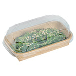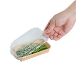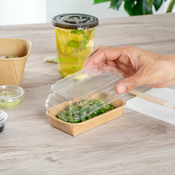 Protect your food toppings with our Matsuri Vision Clear PET Plastic Lids. These plastic lids form a tight-fitting seal with their coordinating sushi containers (SKU: RWA1439K-50) and keep your food intact during transit. Featuring an anti-fog design, these clear lids prevent condensation buildup, allowing customers to easily see the mouthwatering contents inside. These dome lids provide ample room and ensure the delicate arrangements of sushi rolls, nigiri, or sashimi are protected without being squashed or smudged. With a crystal clear finish, these container lids showcase the vibrant colors and appetizing presentation of the sushi inside. These lids for food containers are made from premium PET plastic for robust durability and sturdiness. Ideal for eco-conscious foodservice establishments, these disposable lids are recyclable to minimize your carbon footprint. For an easy cleanup, these to go sushi container lids are disposable and can be discarded after use. Measuring 5.5 inches in length by 3.25 inches in width by 1.25 inches in height, these clear plastic lids offer a perfect fit for your needs. Sold in a 50 count box. Containers are available and sold separately.
