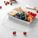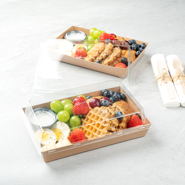 Securely lock in customers' food orders using our Matsuri Vision Clear Plastic Lids. Pair these plastic lids with our compatible Matsuri Vision trays to efficiently package to go orders (SKU: RWA1048BR, RWA1048W, RWA1048B, and RWA1048K). These clear lids are built with a snap-on design to prevent accidental openings or spills while on the go. Constructed with indented and curved corners, these transparent lids are durable to avoid cracking or breaking while opening or closing the packed foods. Featuring a crystal clear finish, these to go sushi container lids allow employees to view packaged meals to avoid order mixups. Crafted from PET plastic, these sushi tray lids are recyclable to shorten your cleaning process. These clear plastic lids measure 9 inches in length by 6 inches in width. Sold in a 100 count box. Compatible Matsuri Vision trays are available and sold separately.