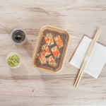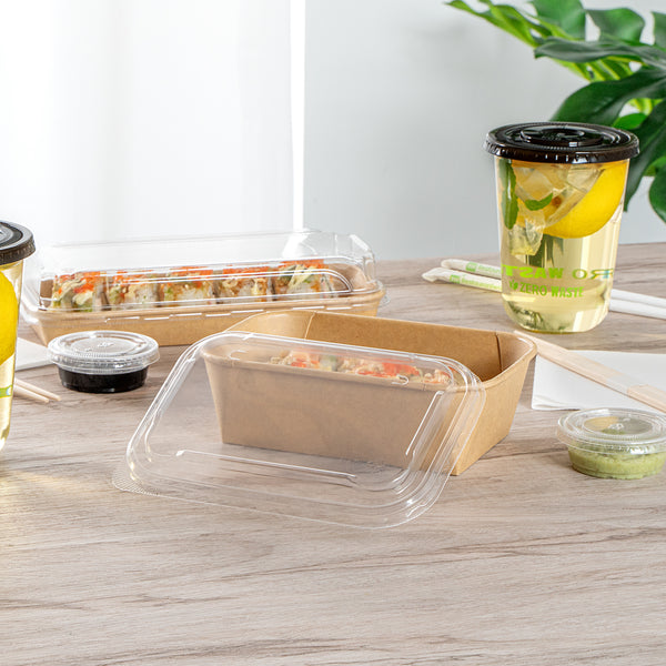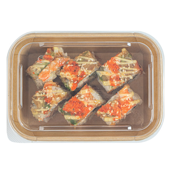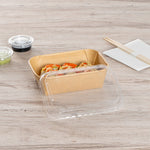 Present your sushi creations with our Matsuri Vision Clear PP Plastic Lids. These plastic lids can be paired with our collection of compatible Matsuri Vision sushi containers and form a tight seal to keep your food intact during transportation. With an anti-fog design, these container lids avoid condensation buildup and ensure your customers can see what is packed inside. These lids for food containers feature a crystal-clear finish for an elegant touch and beautifully showcase your sushi arrangement. Crafted from premium plastic, these clear lids boast robust durability and sturdiness, ensuring your culinary creations are securely packed. These clear plastic lids are disposable and allow you to discard them after use for a straightforward cleanup. To minimize your carbon footprint, these disposable lids are recyclable and suitable for environmentally-conscious foodservice establishments. Each to go sushi container lid measures 6.75 inches in length by 4.75 inches in width by 0.75 inches in height. Sold in a 50 count box. Containers are available and sold separately.