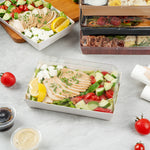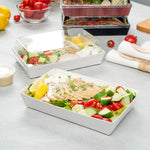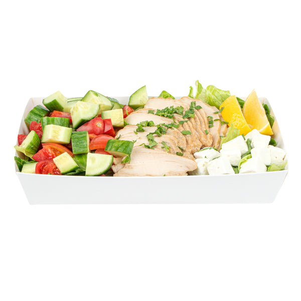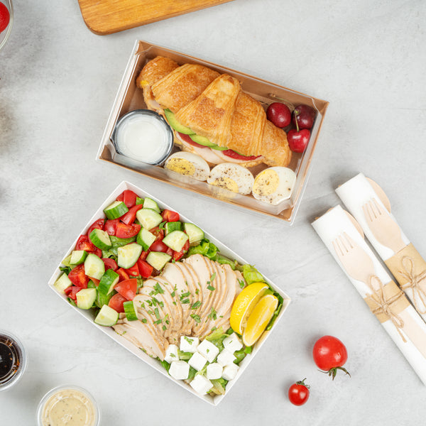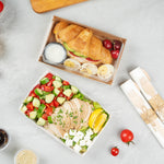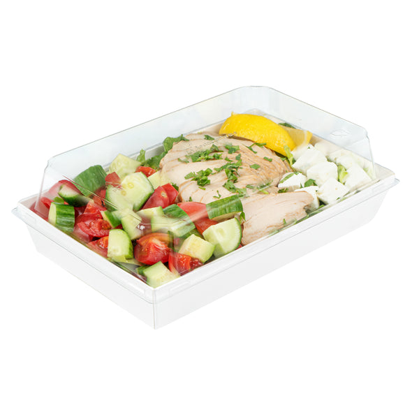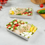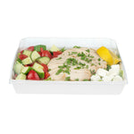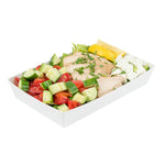 Efficiently pack up orders using our Matsuri Vision Rectangle White Paper Medium Sushi Trays. For mess-free service, these sushi containers are equipped with a greaseproof PE lining. To securely cover guests' off-premise orders, coordinate these to go containers with our compatible Matsuri Vision Lids (SKU: RWA1047C). Featuring a white finish, these to go sushi trays provide a classic look to your restaurant's food orders. Crafted from high-quality paper, these medium sushi trays are recyclable to promote a positive environmental impact. For space-saving storage, these paper sushi boxes are easily stackable. These white sushi trays have a total measurement of 8 inches in length by 5 inches in width by 1.5 inches in height. Sold in a 100 count box. Compatible Matsuri Vision lids are available and sold separately.