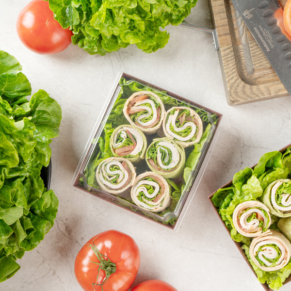 To take meals with you, our containers can be covered with our matching lids to securely seal your food. By combining containers with our crystal clear lids, guests will be able to take a peek inside each container.