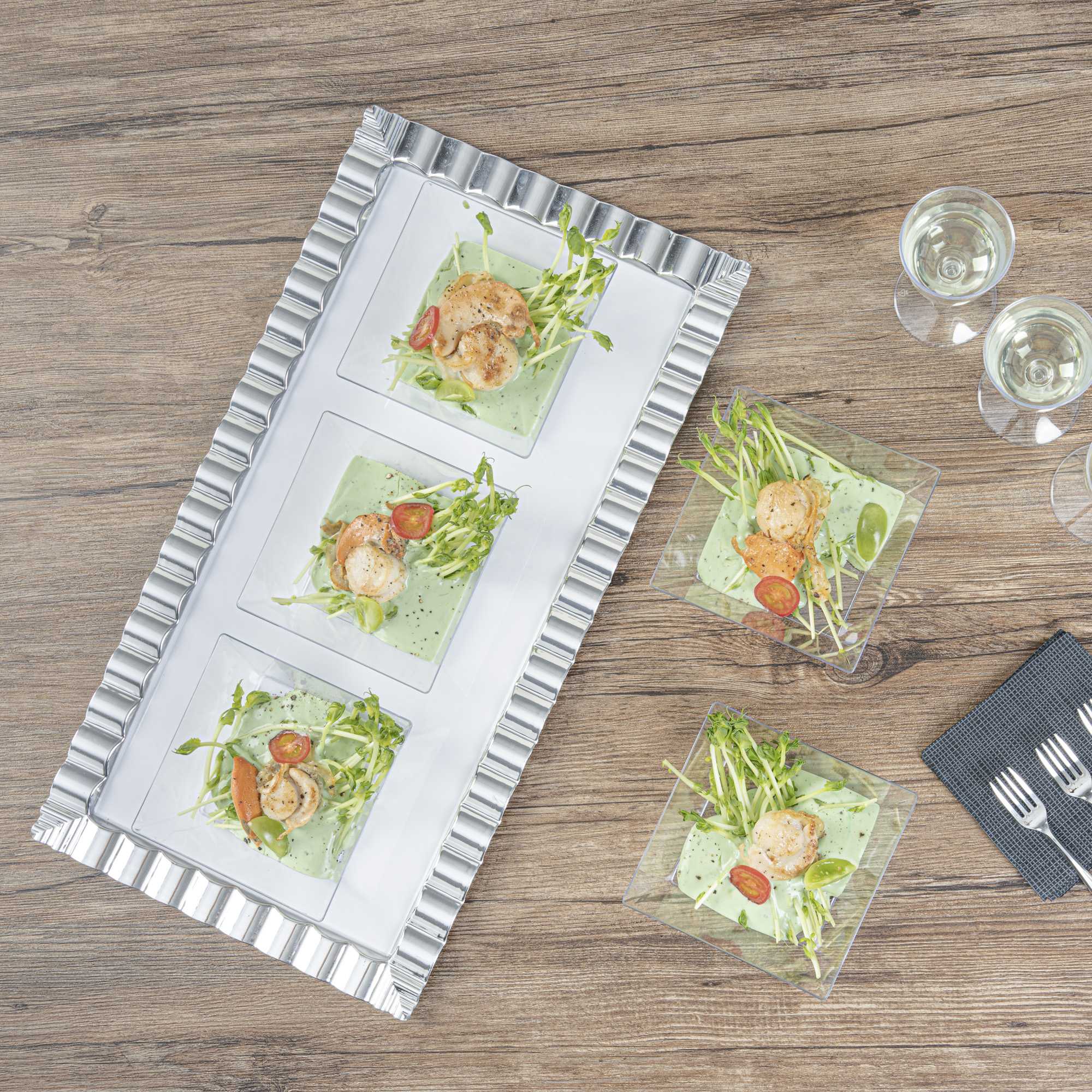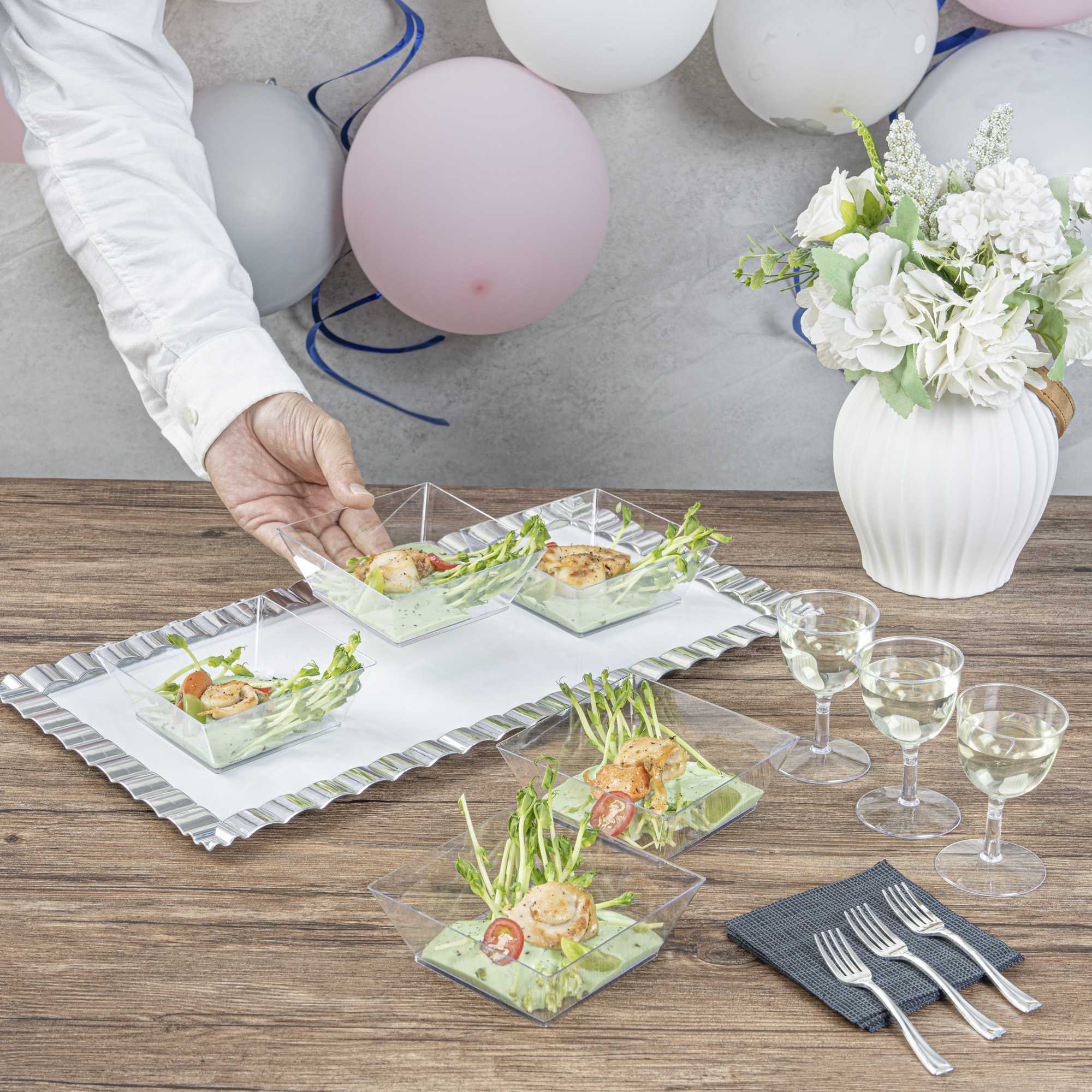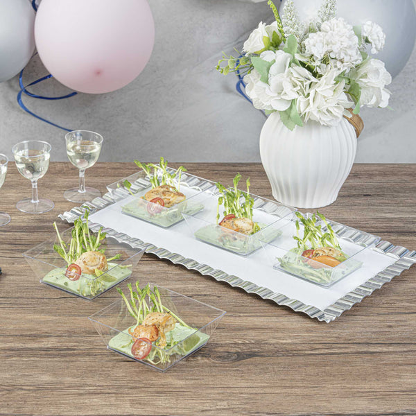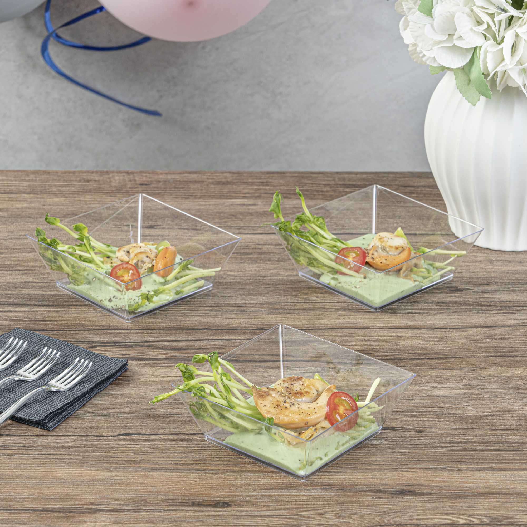 Unveil your salads and other delights in our Maxi Serve 10-ounce Square Clear Plastic Small Modern Bowls. Fabricated using top-tier plastic, these clear bowls promise enduring durability and are ideally suited for various wet, dry, or chilled delicacies at your themed catering occasion.These plastic bowls have a contemporary square silhouette and act as an appealing canvas that highlights the allure of your servings. With a capacity of 10 ounces, these square bowls are ideally sized for single-serving meals. These salad bowls have a transparent finish that elevates the visual appeal, breathing life into your culinary presentations. Constructed with a lightweight material, these disposable bowls ensure comfortable handling and convenience. These food containers are conveniently disposable to smoothen your post-event chores. Measuring 4.25 inches in length by 2.25 inches in width by 1.5 inches in height, these serving bowls can accommodate up to 10 ounces. Sold in a 100 count box.