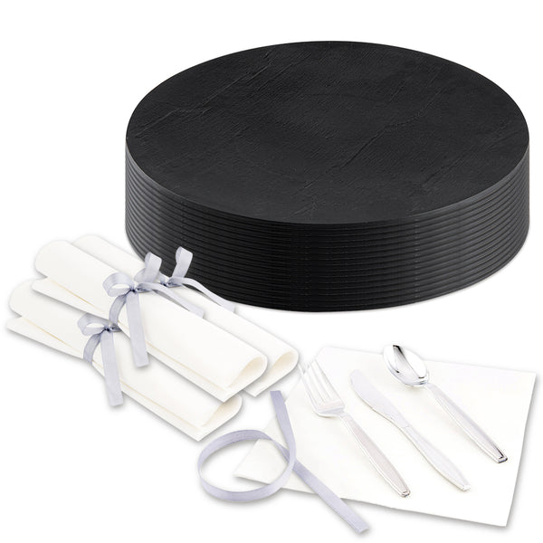 Impress your guests effortlessly with our Bundle: Maxi Serve Round Black Plastic Medium Plates with Argento Silver Cutlery Sets, offering both style and practicality for any occasion. This bundle includes 100 round black plastic plates and 100 silver plastic cutlery sets, each featuring a spoon, fork, knife, and napkin tied with a charming silver ribbon. The robust black plates, mimicking the look of slate, are ideal for serving wet, dry, and cold dishes, enhancing food presentations with their chic design. Their elegant black finish complements any table setting, and their lightweight and portable nature ensures easy handling. The silver plastic cutlery sets are sturdy and effortlessly coordinate with the plates to ensure guests can enjoy their meals without messes or breakages. Both the plates and cutlery sets are made out of plastic that can be easily disposed of at the end of your event. These disposable plates, measuring 8.7 inches in diameter, are perfect for serving single portions of your signature dishes. The sturdy plastic dining sets effortlessly coordinate with any meal, allowing guests to enjoy their food without messes or breakages. Each order includes 100 plastic plates and 100 cutlery sets.