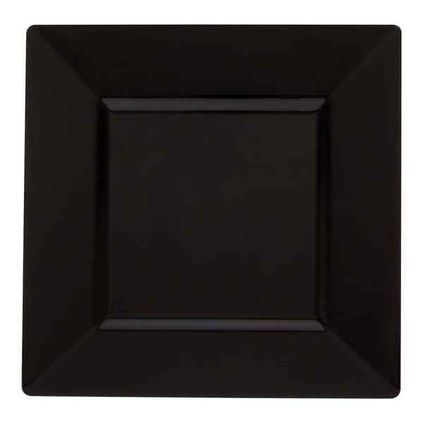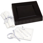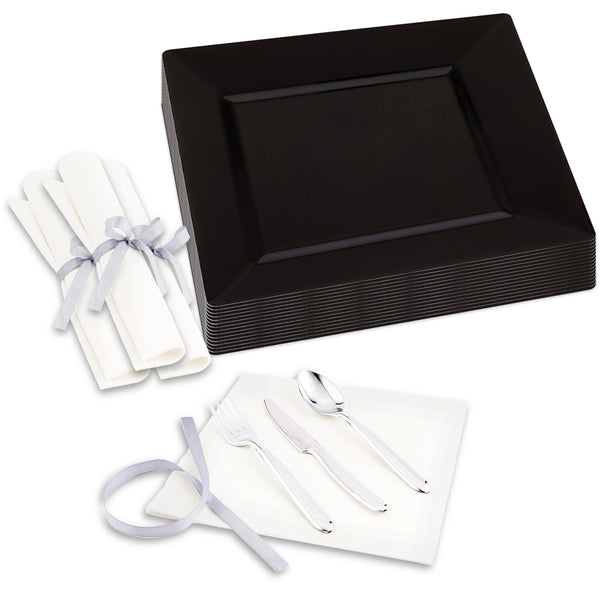 Make your next event a hit with our Bundle: Maxi Serve Square Black Plastic Dinner Plates and Moderna Silver Plastic Cutlery Sets bundle, offering a stylish and convenient solution for all your serving needs. This bundle includes 100 square black plastic dinner plates and 100 silver cutlery sets, providing a complete tableware setup. Crafted from premium plastic, the square black plates are durable and sturdy enough to serve various food items without breaking or warping, ensuring a hassle-free dining experience. Featuring a sleek black finish and a modern square design, these plates add a contemporary touch to your restaurant, café, catered event, or any dining occasion. Whether you're presenting herb-crusted halibut at a catered luncheon or serving tasty chicken marsala at your restaurant, these plates beautifully display your culinary creations. Complementing the plates, the silver cutlery sets offer a convenient solution for serving any dish, with each set including a spoon, fork, and knife tied together with an elegant silver ribbon. Built from premium plastic, these silver cutlery sets are disposable, ensuring easy cleanup after use. Wrapped in napkins, these utensils allow your customers to enjoy their meals comfortably while avoiding messes. The plates measure 10.8 inches in height and width to showcase your snacks. Each order includes 100 plastic plates and 100 cutlery sets.
