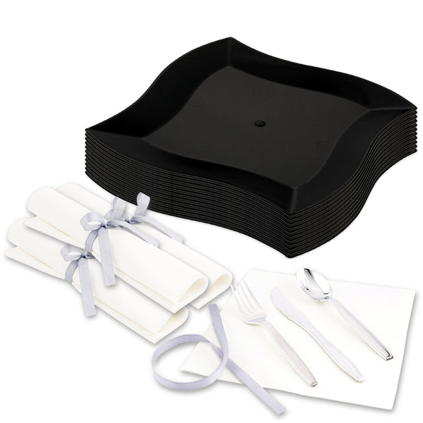 Make hosting a breeze with our Bundle: Maxi Serve Square Black Plastic Medium Aqua Plates and Argento Silver Plastic Cutlery Sets, providing a stylish and hassle-free solution for all your catering and foodservice needs. This bundle features 100 black plastic plates and 100 silver plastic cutlery sets, both made from durable plastic for dependable use. The modern, asymmetrical design of the black plates adds a unique flair to your food presentations, while the raised edges ensure your dishes stay securely in place. Paired with the plates are silver cutlery sets, each including a spoon, fork, knife, and napkin, wrapped with a sophisticated silver ribbon for an added touch of elegance. These disposable plastic plates and cutlery sets make cleanup effortless, removing the need to wash them after your event. The plates measure 7 inches by 7 inches, making them perfect for showcasing appetizers. Each order includes 100 plastic plates and 100 cutlery sets.