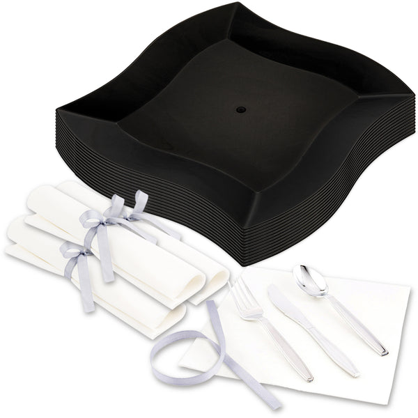 Effortlessly host your next event with our Bundle: Maxi Serve Square Black Plastic Large Aqua Plates and Argento Silver Plastic Cutlery Sets, offering a sleek and practical solution for your dining needs. This set includes 100 durable and stylish disposable plates alongside 100 sophisticated silver plastic cutlery sets, each tied with a refined ribbon. The elegant curved edges of the plates bring a modern flair to any table setting, elevating the presentation of gourmet dishes like steak, chicken, and fish. The raised borders are designed to securely hold saucy meals like pasta without risk of spillage, making these plates ideal for any dish. These black square plates provide a contemporary twist to traditional dining, while the silver plastic cutlery sets, complete with a spoon, fork, knife, and napkin, offer convenience for serving every course. The cutlery sets come wrapped in premium napkins, ensuring a mess-free dining experience. Constructed from plastic, these disposable cutlery sets and plates are conveniently disposable to streamline your cleaning process. The square plates are 9 inches long and wide, perfect for presenting entrees and side dishes. Each order includes 100 plastic plates and 100 cutlery sets.