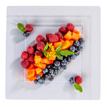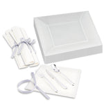 Enhance your gathering with our Bundle: Maxi Serve Square Clear Plastic Modern Plates with Moderna Silver Plastic Cutlery Sets, offering an elegant and hassle-free solution for all your events. This bundle includes 100 premium plastic dinner plates and 100 plastic silverware sets, providing a complete tableware solution. The dinner plates boast a chic, geometric square design with raised edges, ensuring secure food placement and an engaging presentation. Crafted from durable plastic, these plates won’t easily break, ensuring longevity. The transparent finish conveys an air of sophistication, perfect for any event setting. The plastic cutlery sets feature a spoon, fork, and knife wrapped in an elegant silver ribbon and napkin, adding a modern touch to your table. Built from premium disposable plastic, these utensils allow customers to enjoy meals and easily throw away used cutlery. The plates measure 9.5 inches in length and width to showcase your signature dishes. Each order includes 100 plastic plates and 100 cutlery sets.