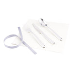 - Cutlery sets include a fork, spoon, knife, and napkin tied together with a silver ribbon for easy setup and added sophistication