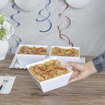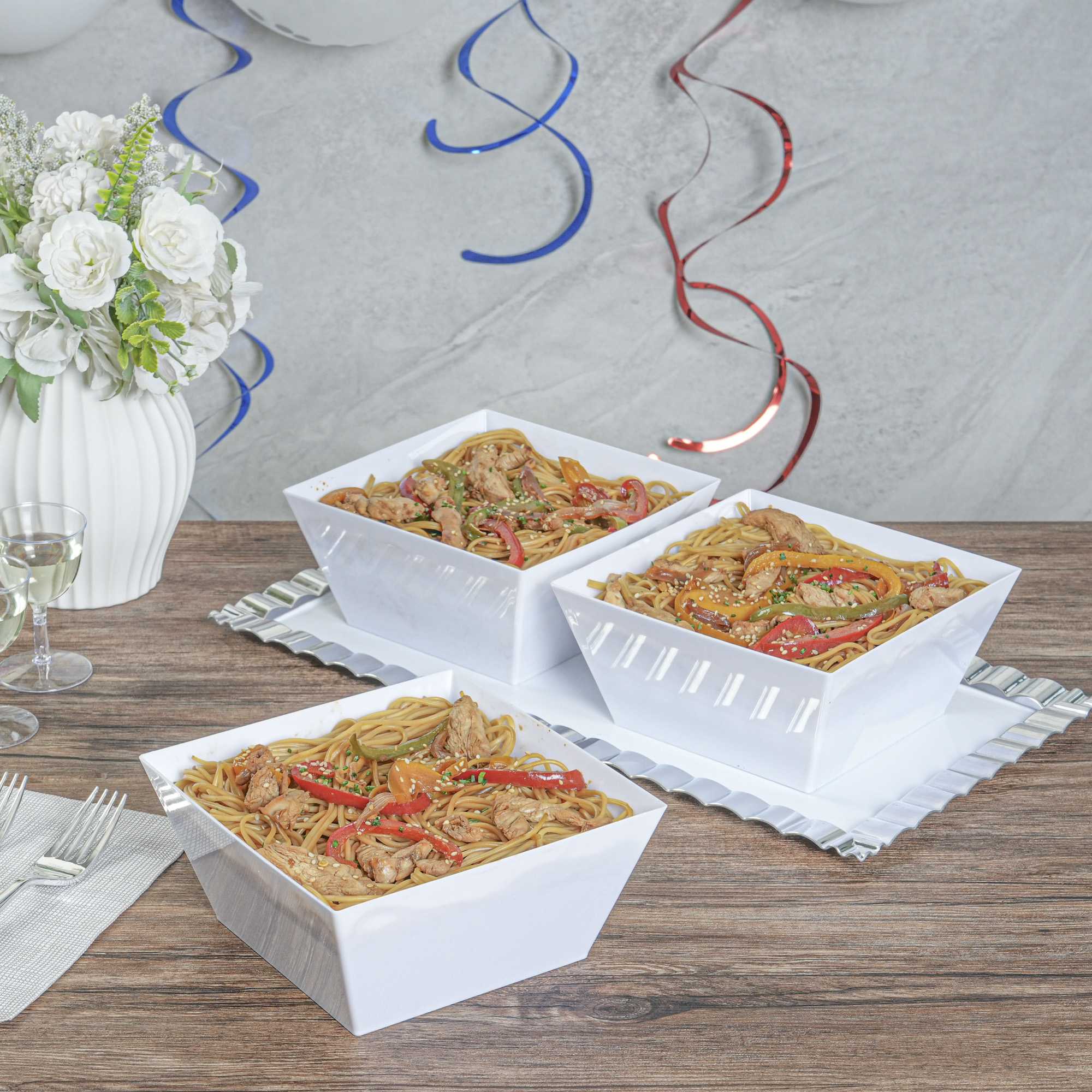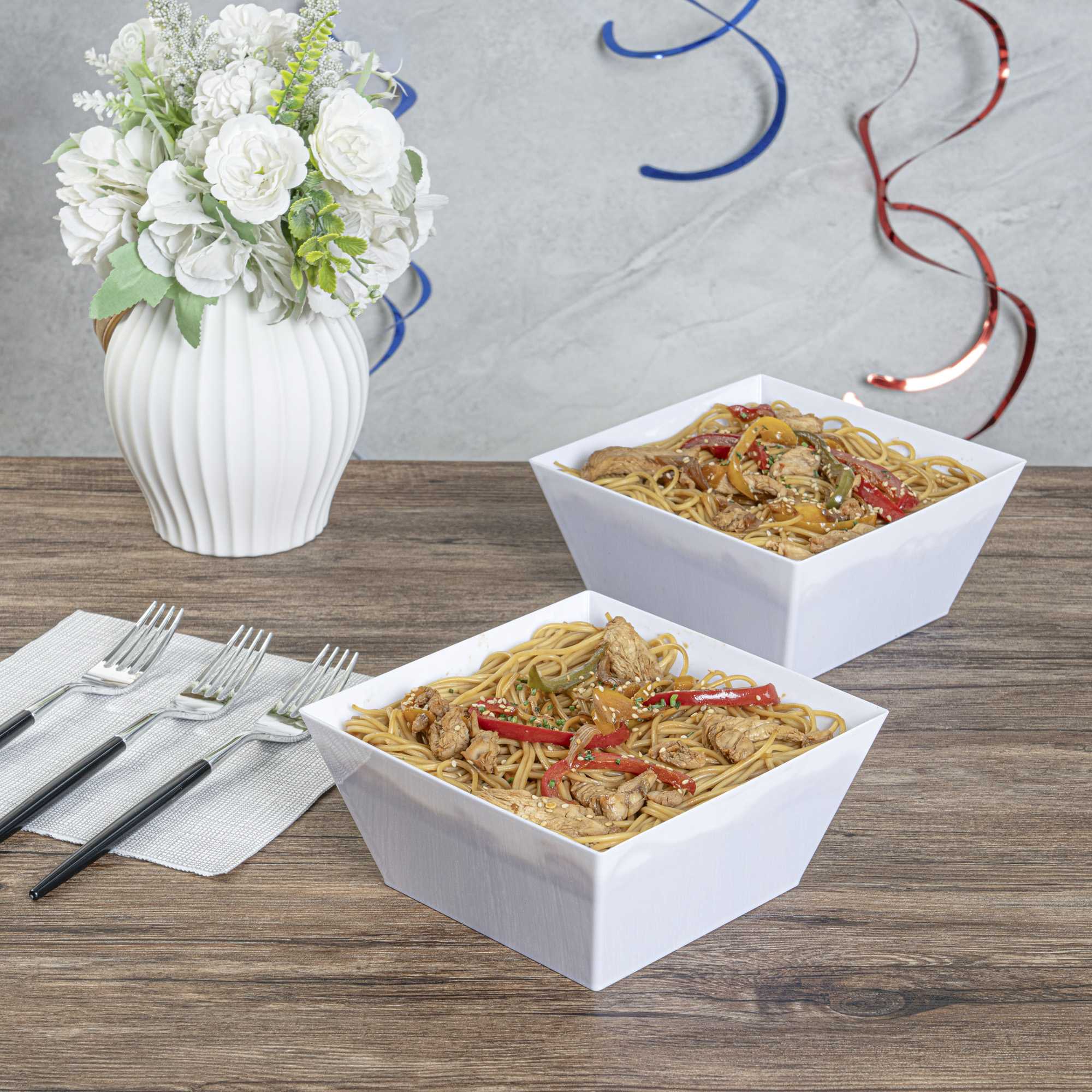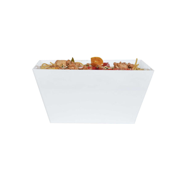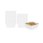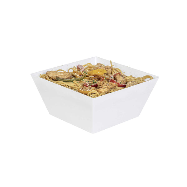 Our Medium White Modern Bowls will enhance any food presentation with ease. Made of premium recyclable plastic, these 18 ounce disposable plastic bowls won't crack under the pressure of your delicious dishes. These white serving dishes are great for catering events, corporate parties or cocktail hours. With a sleek white finish and modern design, these disposable white plastic bowls will suit any setting and are recyclable. Use them as a quick and easy serving solution at your fast-casual restaurant, or to elegantly offer a selection of salads at your next catering event. Mix and match these disposable plastic bowls with our Maxi Serve coordinating clear and black Medium Modern Bowls (including SKUs: RWP0144C and RWP0144B) to create an aesthetically pleasing display. Each of these 18 oz square plastic bowls measures 6.7 inches wide and 3.1 inches tall. Available in a 25 count box.