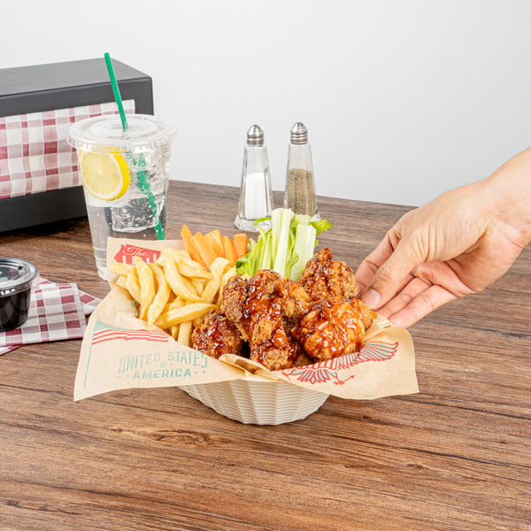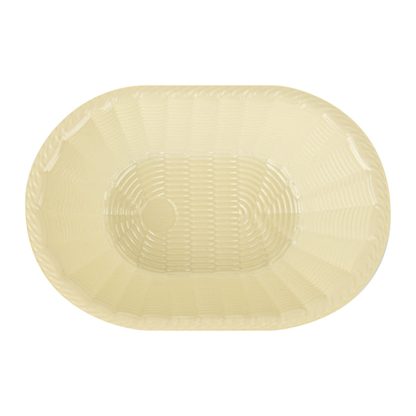 Make your event outstanding with our Maxi Serve 25-ounce Cream Plastic Oval Food Serving Baskets. These oval bread baskets mimic the look of hand-woven baskets, giving your food presentation a rustic look. The sturdy, plastic construction of these disposable food baskets makes them versatile and ideal for any catering event. These fast food plastic baskets are disposable and recyclable, allowing for easy cleanup after use. The oval shape of these food serving baskets provides ample space for sauces, sides, and entrees. These plastic food baskets are lightweight yet durable enough to securely transport food. The cream color of these disposable plastic food serving baskets complements any tablescape. These premium plastic baskets have a capacity of 25 ounces and measure 9.25 inches in length by 6.25 inches in width by 2.5 inches in height for generous portions. Sold in a 25 count box.