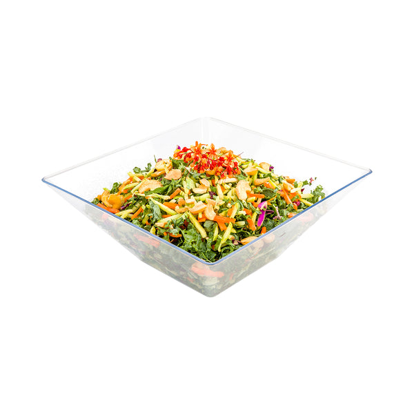 Elevate any celebration with our Maxi Serve 56-ounce Clear Plastic Modern Small Catering Serving Bowls. With a trendy-looking, square design with raised edges, these disposable plastic serving bowls are perfect for catered events. With sturdy yet lightweight plastic construction, these recyclable serving bowls allow for easy transport and handling. The transparent finish of these 56-ounce bowls showcases your delectable dishes in an appetizing way. These premium plastic bowls are ideal for salads, sides, or snacks. These fashionable clear plastic bowls, with their transparent finish, make an attractive presentation for any occasion. With a disposable design, these plastic serving bowls help cut down on cleanup time. These catering bowls have a generous 56-ounce capacity, measuring 8.5 inches in length by 8.5 inches in width by 3.5 inches in height, to hold plenty of food. Sold in a 25 count box.