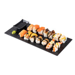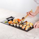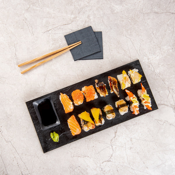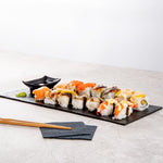 Serve culinary creations with our Maxi Serve Rectangle Black Plastic Large Plates. Crafted from high-quality plastic, these party plates are perfect for serving various cold food items at buffets. These serving plates, while mimicking the look of a slate, have the lightweight and portability of plastic plates for easy handling. Featuring a sleek rectangle design, these serving dishes elevates the look of your food presentation. The chic black finish of these sushi plates complements the look of all tablescapes. These black plates are conveniently disposable for an easy cleaning process after parties. Measuring 16 inches in length by 7 inches in width, these disposable plates are ideal for serving your signature dishes. Shipped in a 25 count box.