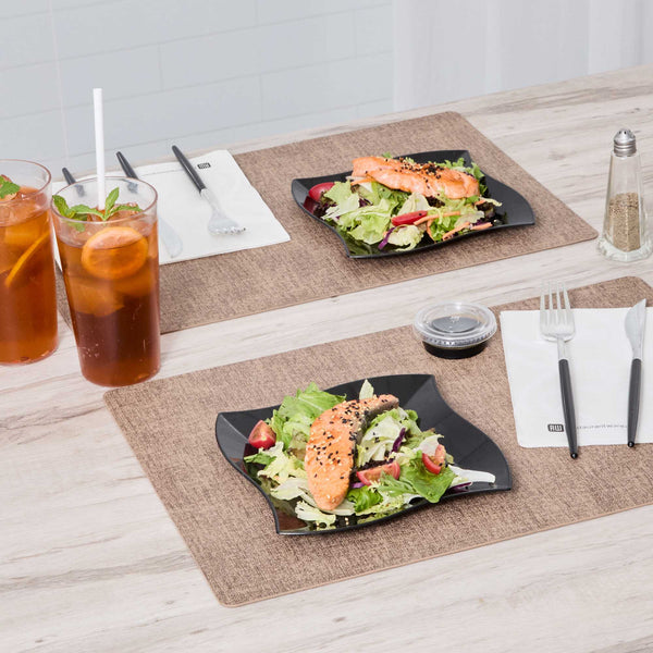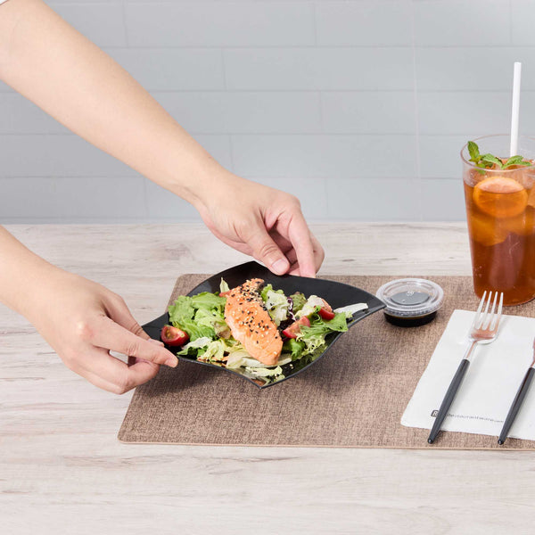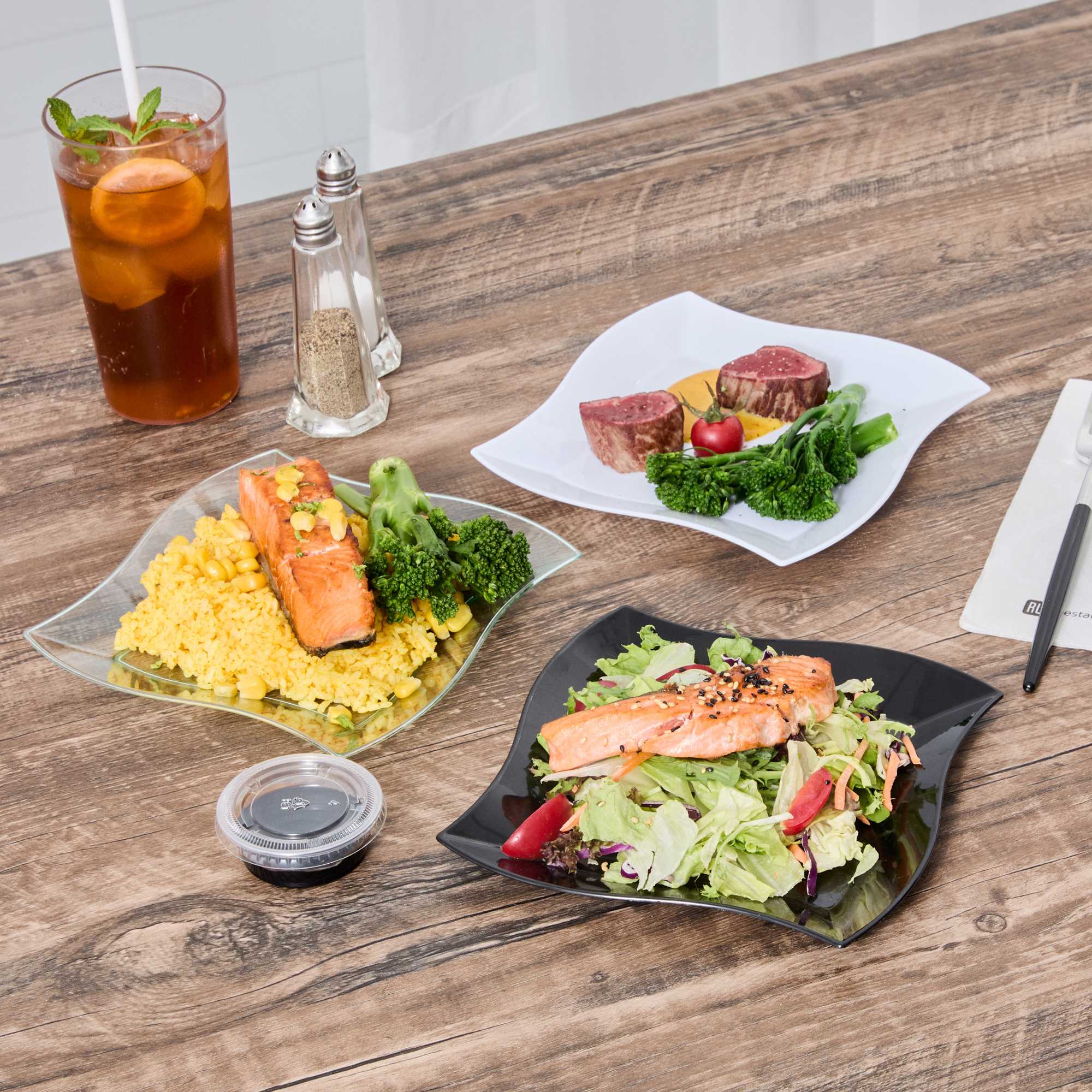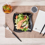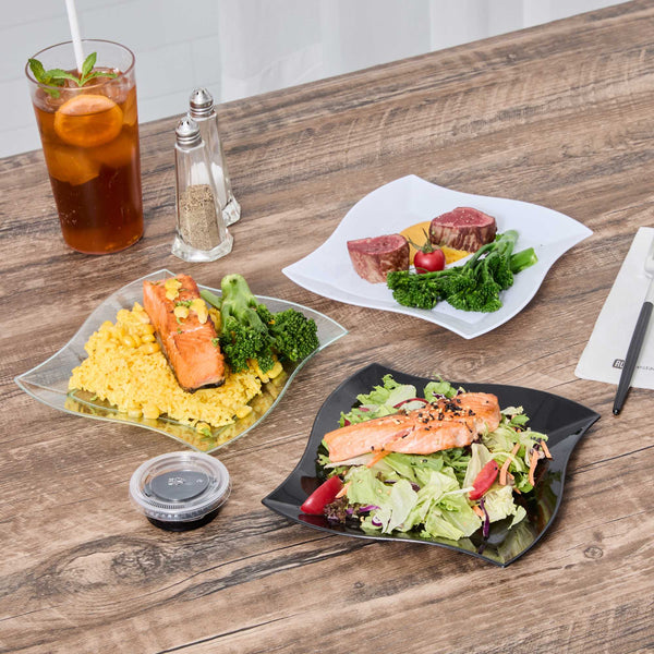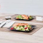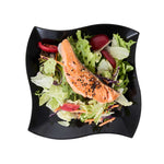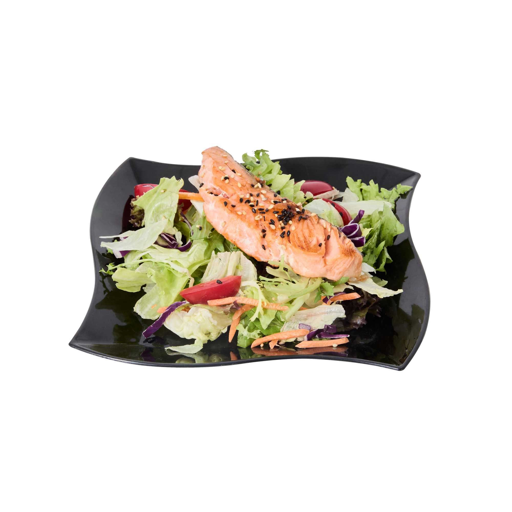 Upgrade your dining experience with our Maxi Serve Square Black Plastic Medium Aqua Plates. Made from premium plastic, these dinner plates provide reliable use without breaking. The asymmetrical design of these chic appetizer plates adds a distinctive touch to your food displays. Featuring raised edges along the sides, these disposable plastic plates securely accommodate your culinary offerings. Their convenient disposability of these black dinner plates streamlines the foodservice process, ensuring easy cleanup. The elegant black finish enhances the aesthetic appeal, giving a luxurious look to any event. Measuring 7 inches in length by 7 inches in width, these disposable food plates are ideal for all catering events or foodservice establishments. Sold in a 100 count box.
