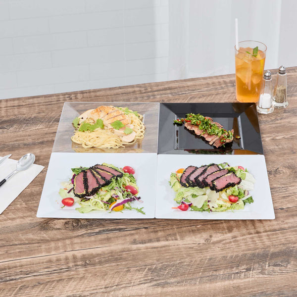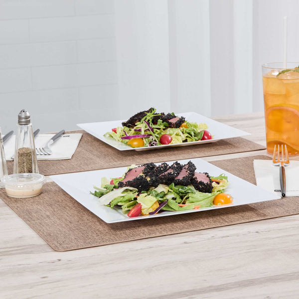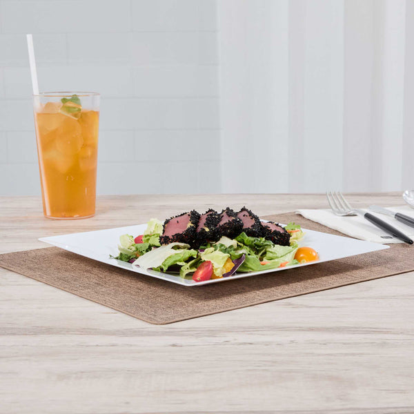 Enhance your dining atmosphere with our Maxi Serve Square White Plastic Plates. Crafted from premium plastic, these dinner plates offer reliable performance and resistance to breakage. Featuring a geometric design, these chic appetizer plates bring a unique touch to your food presentations. The design of these small appetizer plates incorporates raised edges on the sides for secure food containment. The convenient disposability of these white dinner plates streamlines the foodservice process and simplifies cleanup. Their elegant white finish imparts a sense of luxury, making these premium plastic plates a perfect addition to any event. Each stylish appetizer plate measures 9.5 inches in length and 9.5 inches in width. Sold in a 100 count box.
