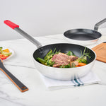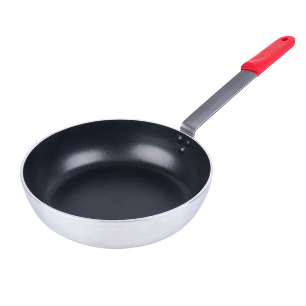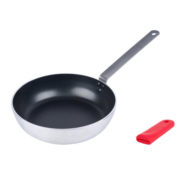 Elevate your culinary endeavors with our Bundle: Met Lux 1 Aluminum 11" Induction Ready Deep Fry Pan with 1 Red Silicone Pan Handle Sleeve. This aluminum fry pan features a non-stick surface, ensuring effortless food release and easy cleanup. The stainless steel bottom plate of this kitchen pan allows it to work with induction cooktops, adding versatility to your kitchen equipment. This skillet pan is designed to be oven-safe and compatible with ceramic and electric cooktops, perfect for both home and professional cooking needs. Made from heavy-duty aluminum, this deep saute pan provides long-lasting performance and even heat distribution for consistently excellent cooking results. The triple-riveted handle of this deep skillet adds enhanced durability and stability, making it easier and safer to handle during cooking. To maintain its pristine condition and optimal performance, this kitchen skillet is hand washable. The handles of this frying pan come with hanging holes for convenient storage options, ensuring your kitchen remains organized. This removable handle sleeve is heat-resistant up to 450F and protects your hands from hot pan handles while cooking. The removable design of this pan handle sleeve allows you to switch between pan effortlessly, saving time and effort in a busy kitchen. With molded indentations, this red silicone sleeve provides a secure grip, and the hanging loop facilitates easy storage. Measuring 20.67 inches in length by 11.26 inches in width by 6.18 inches in height, this cooking skillets offer ample space for all your cooking needs. Each order includes 1 pan and 1 sleeve.