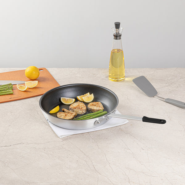 Make pancakes with our Bundle: Met Lux 1 Aluminum 12" Non-Stick Fry Pan with 1 Black Silicone Pan Handle Sleeve. Featuring a non-stick surface, this frying pan prevents food from sticking and ensures an easy cleanup. This fry pan is crafted from 3 mm thick aluminum, ensuring excellent heat distribution for even cooking, enabling you to create perfectly cooked dishes every time. Designed to be induction-ready, this skillet pan expands your cooking possibilities, accommodating various heat sources for versatile culinary applications. The triple-riveted handle of this aluminum fry pan provides a secure grip, enhancing the ease and comfort of your cooking experience by allowing for confident handling. Featuring a convenient hanging hole, this aluminum skillet offers an efficient storage solution, optimizing space in crowded kitchen environments. To maintain its premium non-stick surface, this aluminum fry pan is hand washable, promoting longevity and ease of maintenance. This removable handle sleeve ensures secure handling, with heat resistance up to 450F to prevent burns, even when the pan is blazing hot. The molded indentations on this silicone sleeve offer a firm grip, giving you full control when frying or sauteing, enhancing both safety and precision. With a removable design, this pan handle sleeve offers easy attachment and detachment for versatile use and effortless cleaning. This aluminum skillet pan measures 22.24 inches in length by 11.81 inches in width by 3.94 inches in height. Each order includes 1 pan and 1 sleeve.