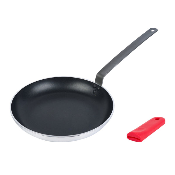 Cook your favorite meals with our Bundle: Met Lux 1 Aluminum 13" Induction Ready Fry Pan with 1 Red Silicone Pan Handle Sleeve. This aluminum fry pan is designed with a non-stick surface, ensuring your meals slide right off the pan and onto your plates with ease, eliminating the need for excess oils while cooking. Equipped with a stainless steel bottom plate, this saute pan is compatible with an induction cooktop, providing quick and even heat distribution for exceptional cooking performance. Made from heavy-duty aluminum, this skillet pan offers unparalleled durability, ensuring it withstands the rigors of a busy kitchen while maintaining superior heat retention. Designed for versatile cooking, this induction frying pan is oven-safe and compatible with ceramic and electric cooktops, adding flexibility to your culinary techniques. Built with a triple-riveted handle, this frying pan ensures a secure connection for effortless handling and safe cooking, making it ideal for home cooks and professional chefs. This aluminum pan’s handle is equipped with a hanging hole for convenient storage and organization, helping to keep your kitchen space tidy. The included silicone pan handle sleeve is heat-resistant up to 450F and enhances your cooking experience by providing a secure grip on hot pans. This removable handle sleeve allows you to switch between pans easily, saving time and effort during busy cooking sessions. Featuring molded indentations, this silicone sleeve offers a secure and comfortable grip, reducing the risk of accidents and ensuring precise control. This kitchen skillet measures 23.5 inches in length by 12.5 inches in width by 5.51 inches in height. Each order includes 1 pan and 1 sleeve.