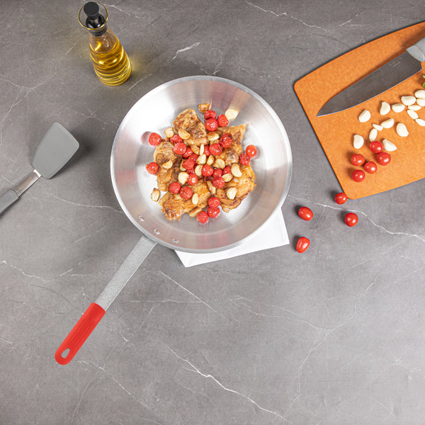 Master every dish with our Bundle: Met Lux 1 Aluminum 14" Fry Pan with 1 Red Silicone Pan Handle Sleeve. This durable cooking pan is made from 3.5 mm thick aluminum, offering exceptional heat distribution for even cooking and browning, ensuring your dishes are cooked to perfection every time. Lightweight yet durable, this cooking pan makes maneuvering in the kitchen effortless, whether flipping pancakes or sautéing vegetables, reducing fatigue during long cooking sessions. Boasting a satin finish, this aluminum fry pan provides superior performance and adds a touch of elegance to your cookware collection, enhancing the aesthetic appeal of your kitchen. The triple-riveted handle of this frying pan offers a comfortable grip for added stability and durability when cooking. For added convenience, this skillet pan features a hanging hole, allowing for easy storage and quick access, optimizing your kitchen space. This aluminum skillet is designed for hand washing, ensuring optimal care and maintenance, prolonging the lifespan of your cookware. The removable design of this pan handle sleeve allows easy cleaning and storage, enhancing your kitchen's efficiency and hygiene. This removable handle sleeve withstands heat up to 450F, ensuring your hands stay cool and secure even during the busiest cooking times, preventing burns and accidents. The molded indentations on this frying pan handle sleeve provide a secure grip, reducing the chances of slips and spills and ensuring a safer cooking environment. This aluminum saute pan measures 25.98 inches in length by 14.17 inches in width by 6.38 inches in height, offering ample cooking surface to cater to your diverse culinary needs. Each order includes 1 pan and 1 sleeve.